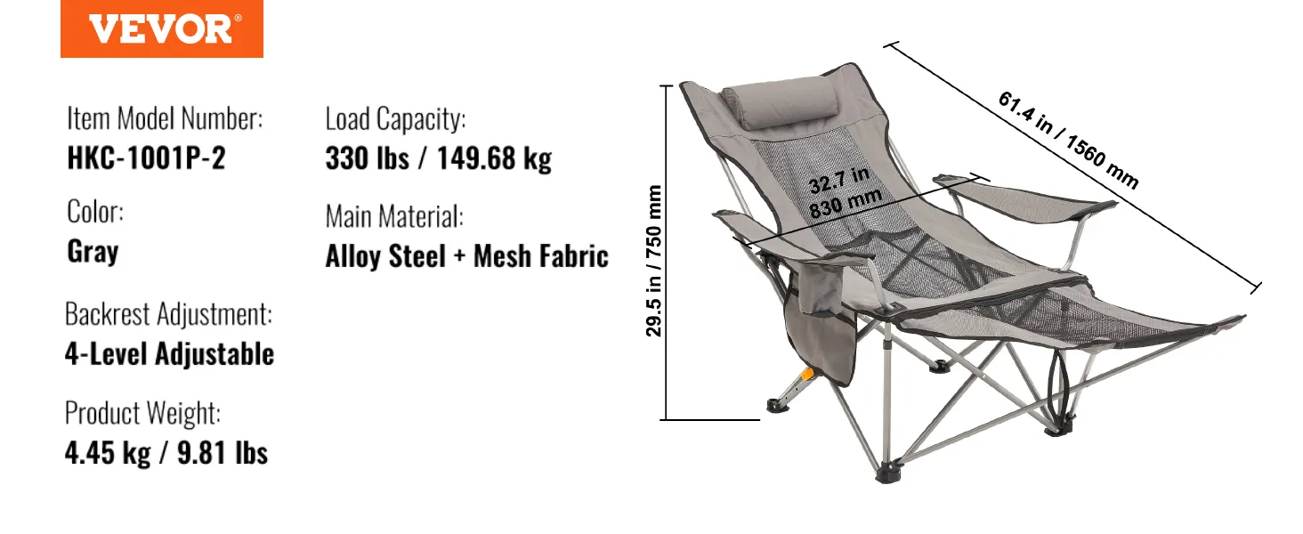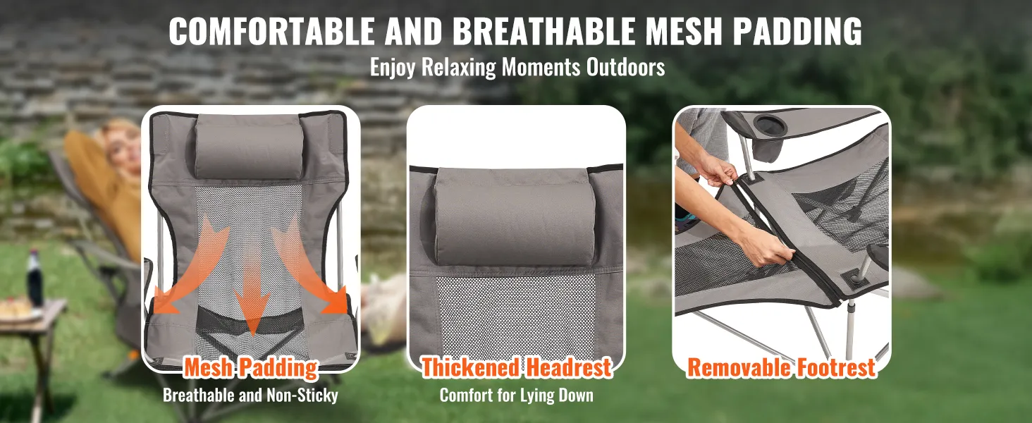 Onze outdoor loungestoel is gemaakt van luxe mesh-stof en heeft een afneembare voetsteun. De dikke hoofdsteun biedt extra ondersteuning en dankzij de afneembare voetsteun kunt u uw comfort aanpassen voor een huiselijke kampeerervaring.