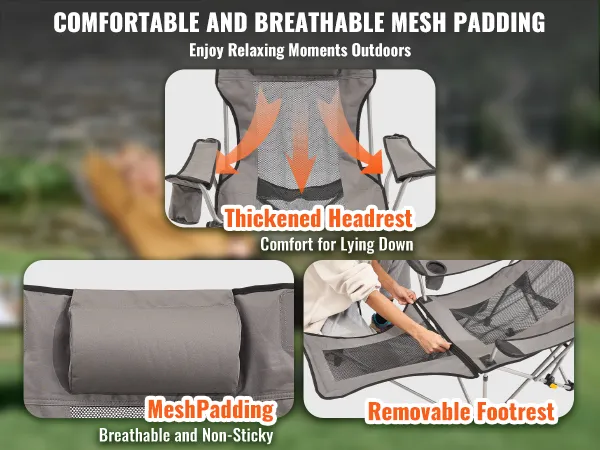 Comfortabele ervaring: de duurzame mesh-voering van onze draagbare stoel wordt gecombineerd met een afneembaar kussen voor zacht comfort. De gewatteerde hoofdsteun ondersteunt uw hoofd en past zich aan de ronding van uw nek aan, terwijl u dankzij de voetsteun heerlijk kunt ontspannen in een liggende positie. De voetsteun is indien nodig ook afneembaar.