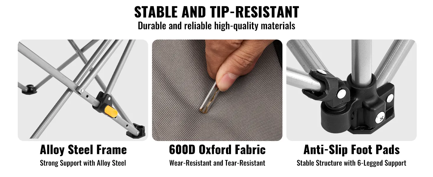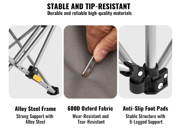 Deze verstelbare campingstoel heeft een draagvermogen tot 150 kg en beschikt over vier hoogtestanden. Het is gemaakt van duurzaam gelegeerd staal en 600D Oxford-stof, lichtgewicht en gemakkelijk te dragen. Hij heeft armleuningen, een zijvak en een bekerhouder.