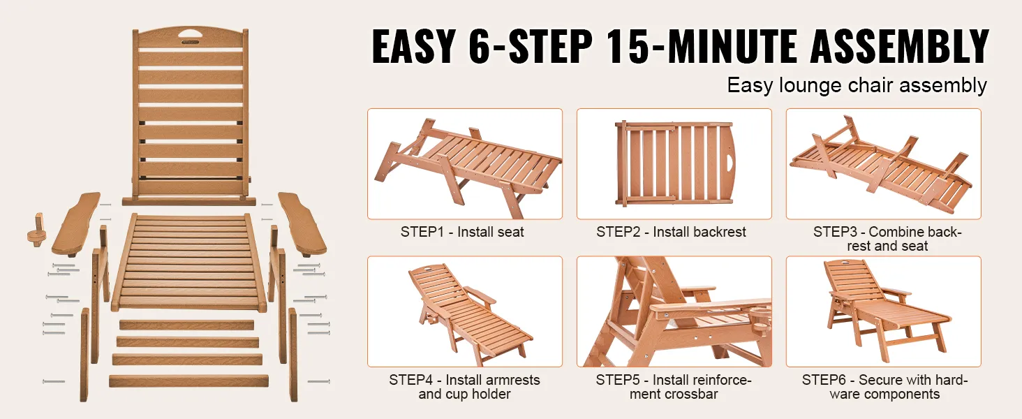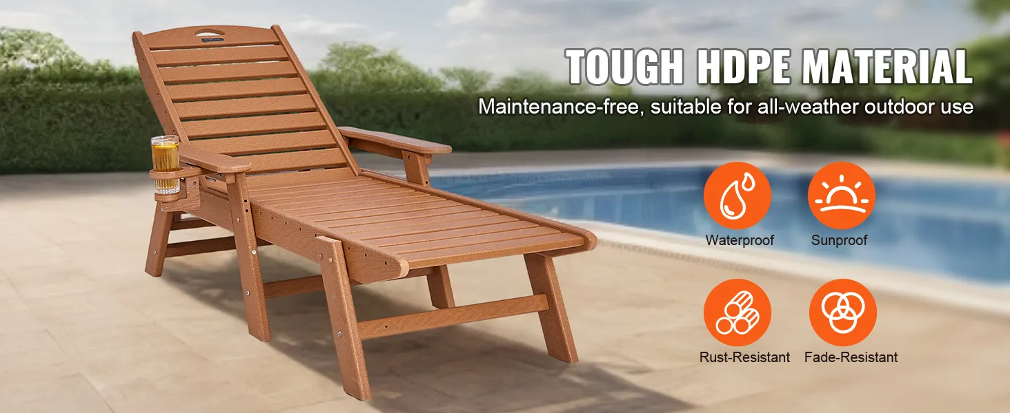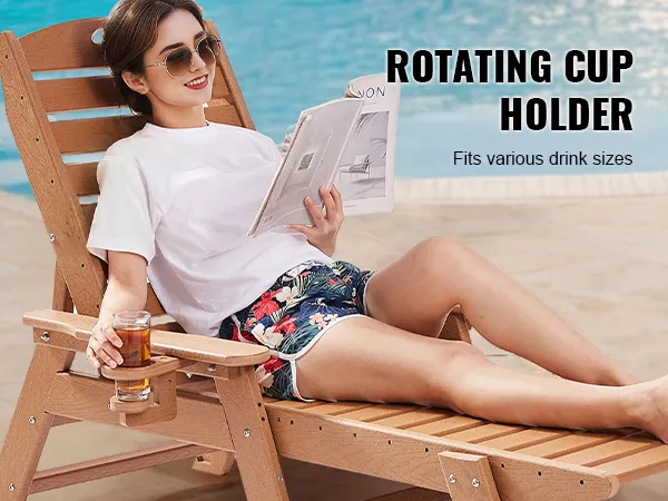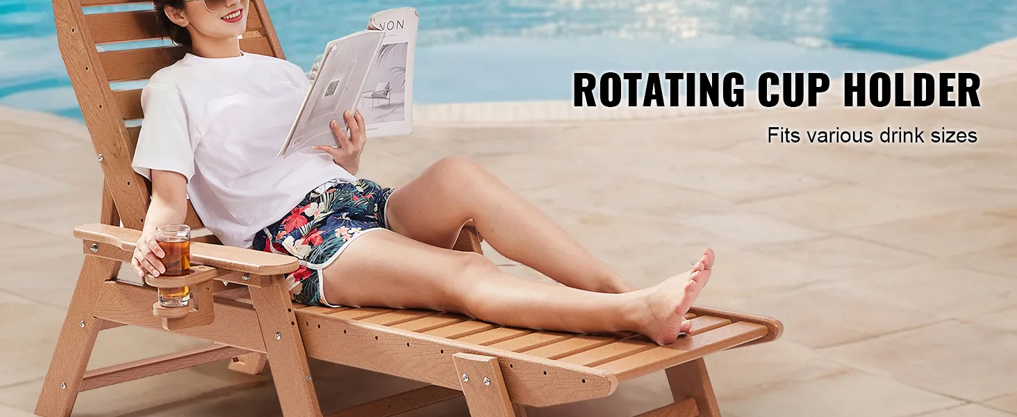 VEVOR Chaise Lounge Chair, draagvermogen 450 lbs, verstelbare patio-loungestoel voor buiten met 6-voudig verstelbare rugleuning, HDPE-loungestoel met bekerhouder voor aan het zwembad, op het terras, in de achtertuin en op het gazon, bruin