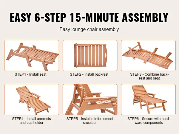 Roestvrije hardwarecomponenten: Uitgerust met roestbestendige hardwarecomponenten met genummerde labels op belangrijke onderdelen en gedetailleerde installatie-instructies, is dit buitenzwembadligstoel eenvoudig te monteren. Je kunt er in een mum van tijd mee ontspannen!