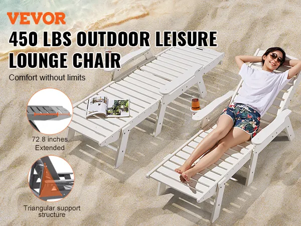Stevig en hoog draagvermogen: deze ligstoel is gemaakt van dik HDPE-materiaal en heeft een sterk driehoekig steunontwerp. Het is extreem robuust en duurzaam. Hij kan maximaal 204 kg (450 lbs) dragen, waardoor hij stabiel en veilig blijft, zodat u met een gerust hart kunt ontspannen.