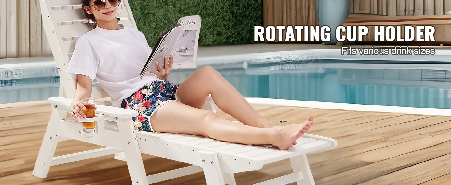 VEVOR Chaise Lounge Chair, draagvermogen 450 lbs, verstelbare patio-loungestoel voor buiten met 6-voudig verstelbare rugleuning, HDPE-loungestoel met bekerhouder voor aan het zwembad, op het terras, in de achtertuin, op het gazon, wit