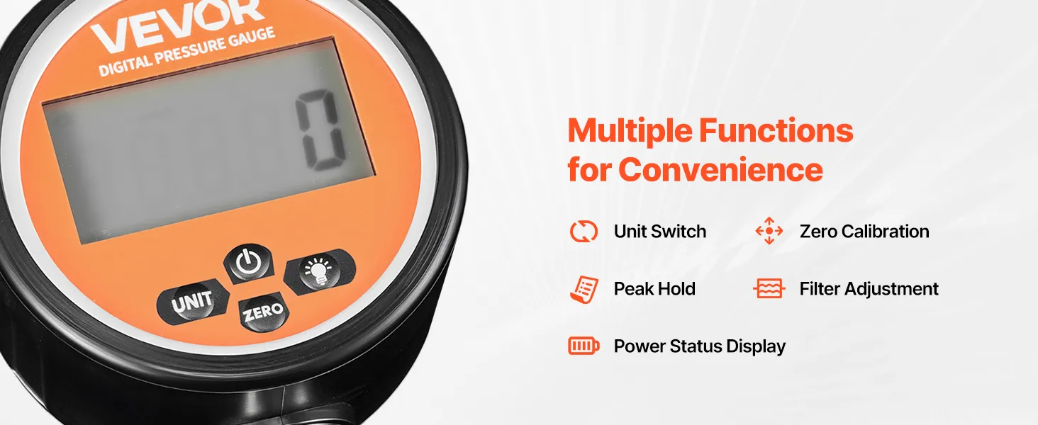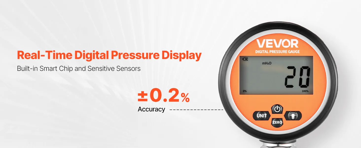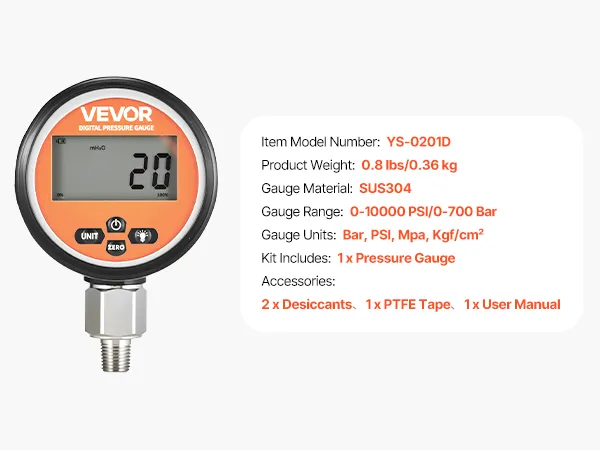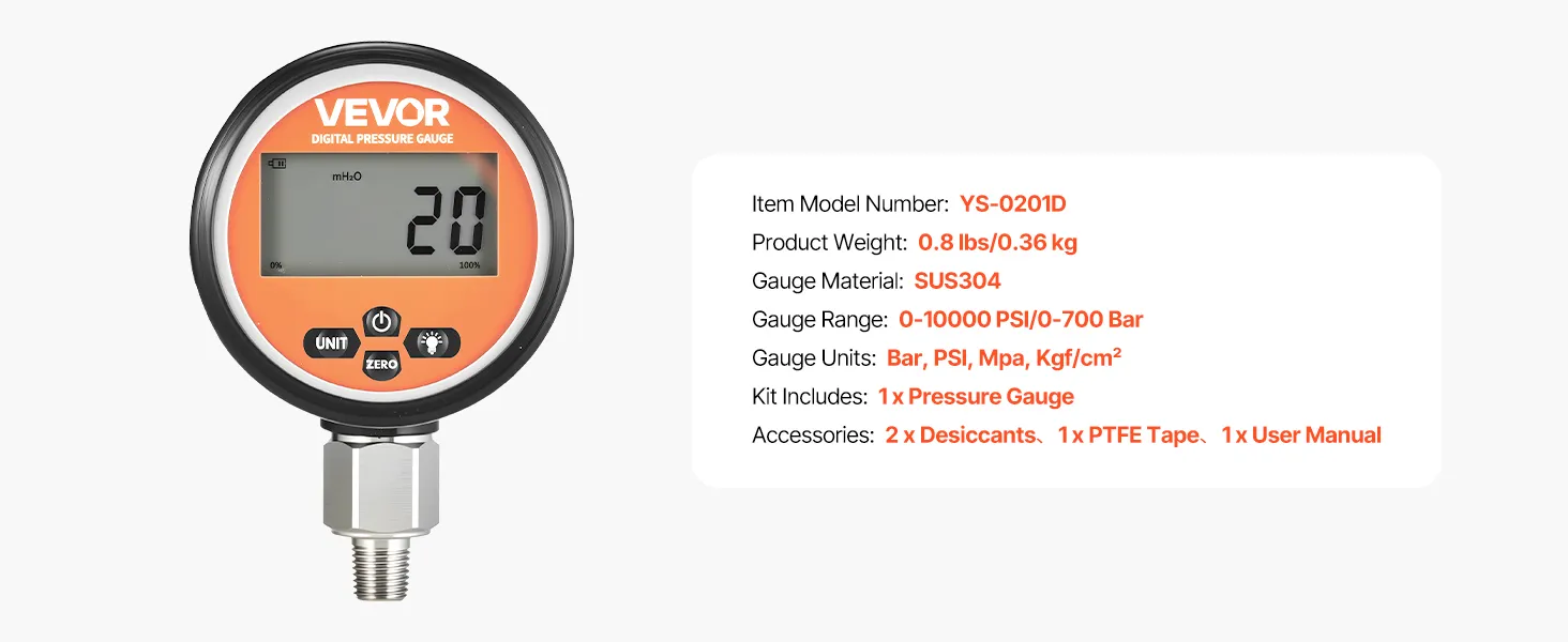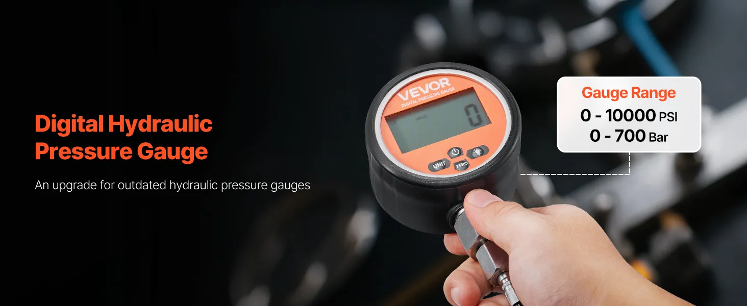 Verbeter uw testnauwkeurigheid met deze digitale hydraulische manometer. Hij levert nauwkeurigere metingen dan conventionele mechanische meters. Ideaal voor veeleisende apparatuurtests of drukbewaking, geschikt voor lucht-, water- en oliedrukmetingen.