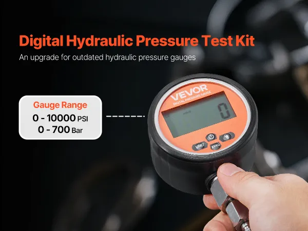 Met de hydraulische testmeter kunt u schakelen tussen PSI en bar, passend bij verschillende apparaten en gebruikersvoorkeuren. Het display met achtergrondverlichting zorgt voor een duidelijke afleesbaarheid, zelfs in donkere omgevingen.