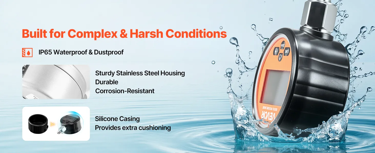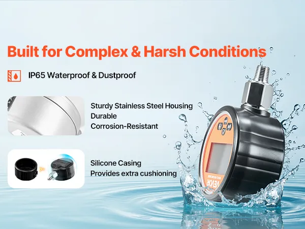 Deze graafmachinemanometer heeft een IP65-classificatie voor stof- en waterbestendigheid, waardoor hij zelfs onder zware omstandigheden betrouwbaar is. De behuizing van roestvrij staal 304 en de siliconen beschermhoes zijn hitte-, corrosie- en schokbestendig, waardoor het risico op gevoeligheidsverlies wordt verminderd.