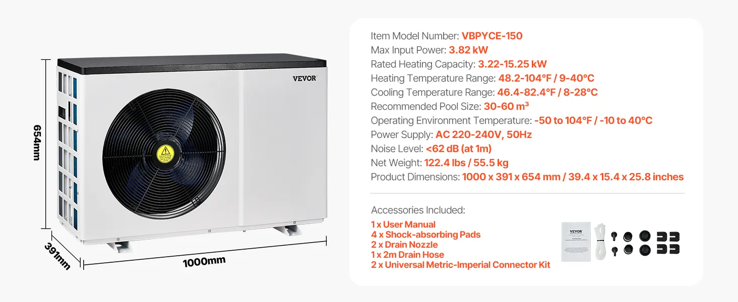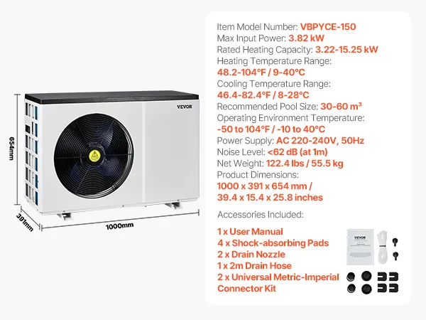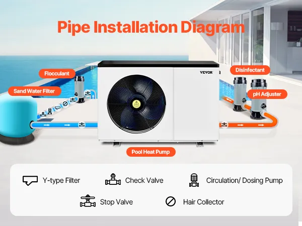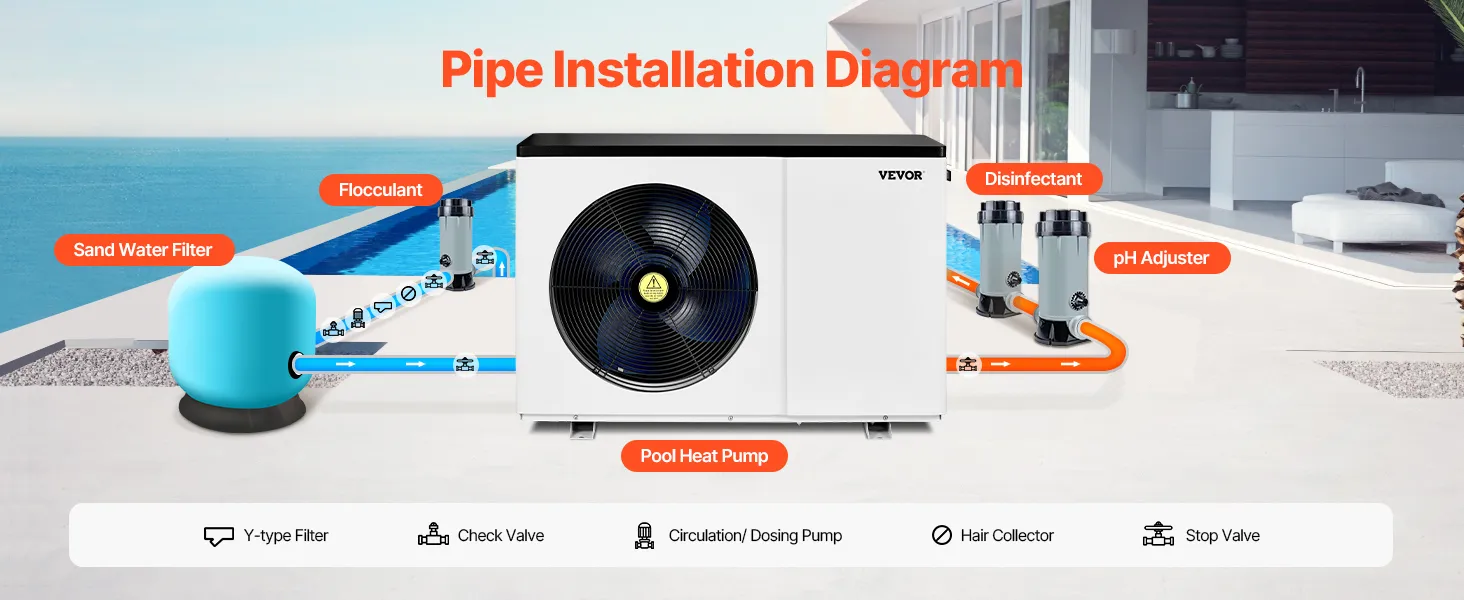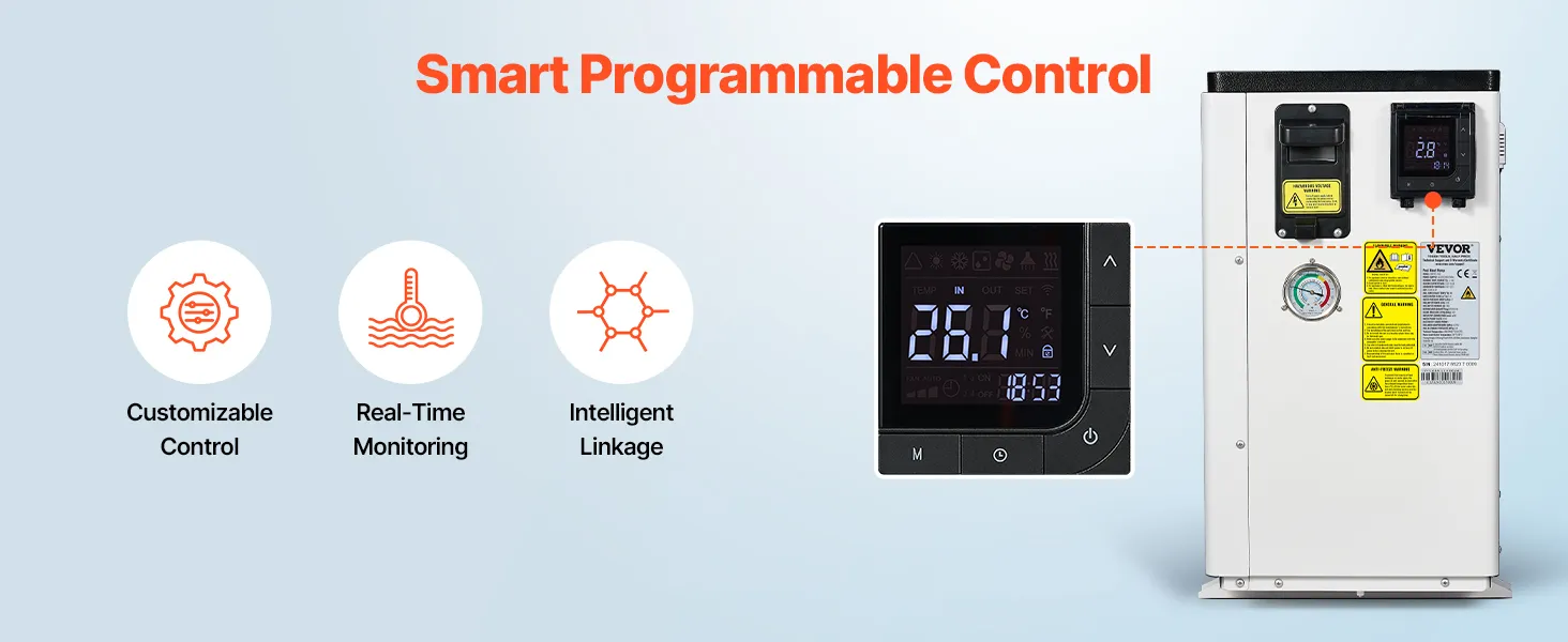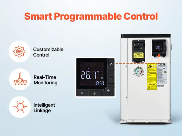 Temperature Control: Offering both heating and cooling options, this pool heater easily maintains your desired temperature. Whether in hot summer or cold winter, enjoy ideal swimming conditions and improved comfort without temperature concerns.