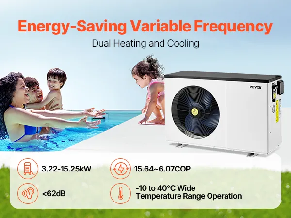 Rapid Heating: With a heating capacity of 3.22-15.25kW, this swimming pool pump quickly raises the water temperature, providing a warm, comfortable swimming experience in above-ground or in-ground pools ranging from 30m³ to 60m³.