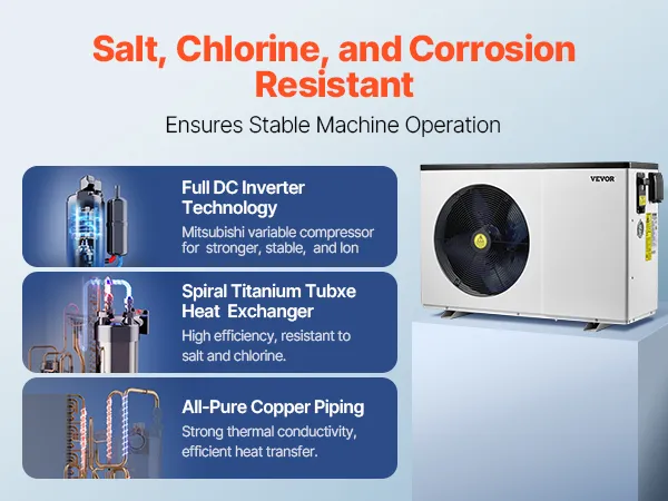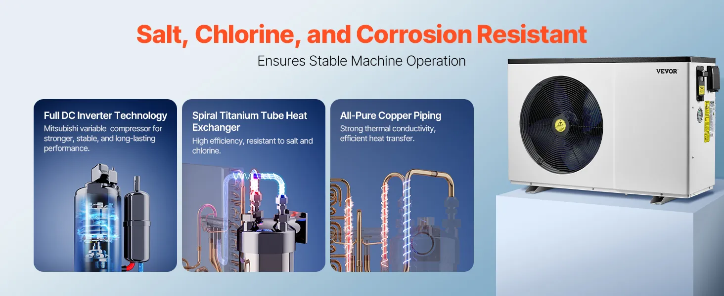Long-Lasting Durability: Featuring a high-performance compressor and titanium tube heat exchanger, this pool heat pump resists salt, chlorine, and corrosion, ensuring stable performance and longevity while minimizing maintenance and replacement needs.