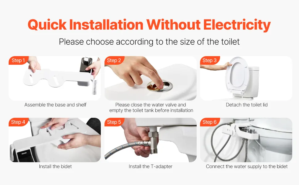 Deze toiletbril-bidetbevestiging is eenvoudig te installeren: geen elektriciteit, geen speciaal gereedschap en geen loodgieterswerk nodig. Meet uw toilet op voordat u het koopt. Tip: Draai de schroeven van de bril niet te vast om het bidet waterpas te houden.