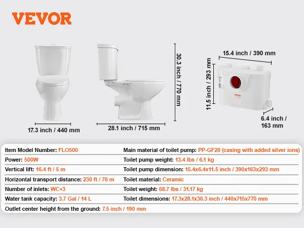 Sterke transportprestaties: Dit vermaler-toiletsysteem is speciaal ontworpen voor woningen zonder vooraf geïnstalleerde afvoerleidingen en beschikt over een duurzame motor van 500 W die uitstekende prestaties levert bij het zuigen van afvalwater en het transport van afvalwater. Dit opwaartse rioolstelsel realiseert een verticale vervalhoogte van 5 meter en een horizontale transportafstand van 70 meter.