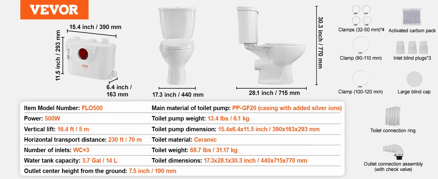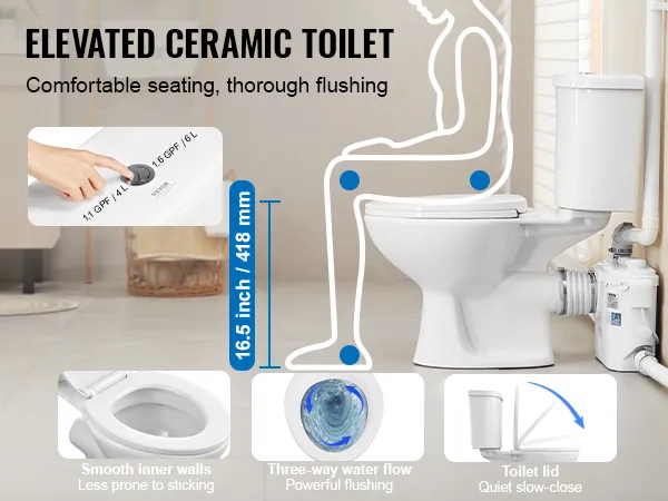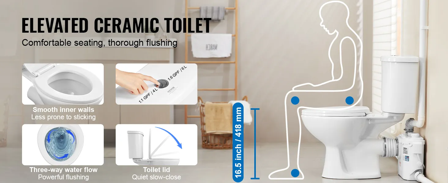 VEVOR Toiletsysteem Crusher Toiletsysteem met krachtige 500W Crusherpomp, toilet met achteruitgang en drijfvermogenspoeling voor kelder, waterafvoer met dubbele spoeling