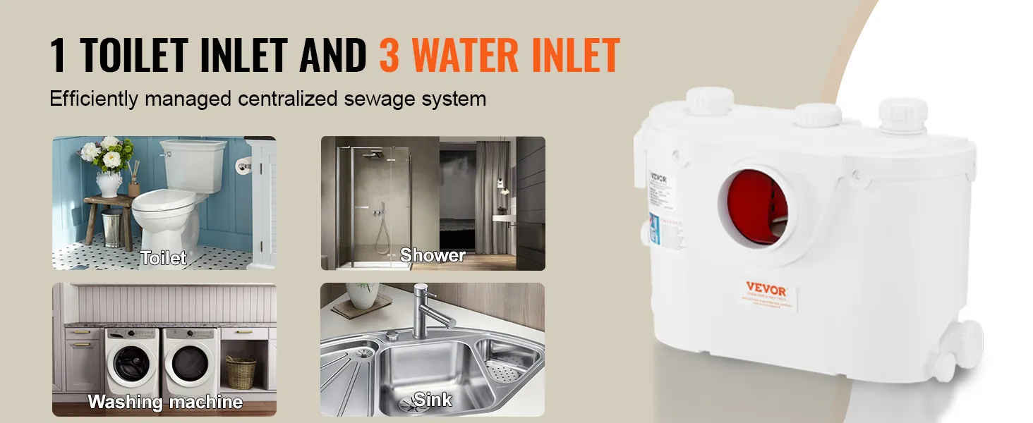 Geïntegreerde afvalwateroplossing: Naast een toiletinterface heeft dit macererende toiletsysteem met pomp 3 extra inlaten voor het aansluiten van wastafels, badkuipen, douches, wasmachines en andere afvalwaterbronnen. Het beheert effectief meerdere bronnen van afvalwater, waardoor het de perfecte oplossing is voor het creëren van een complete sanitaire ruimte waar dan ook, zoals kelders.