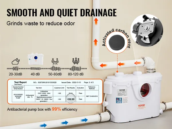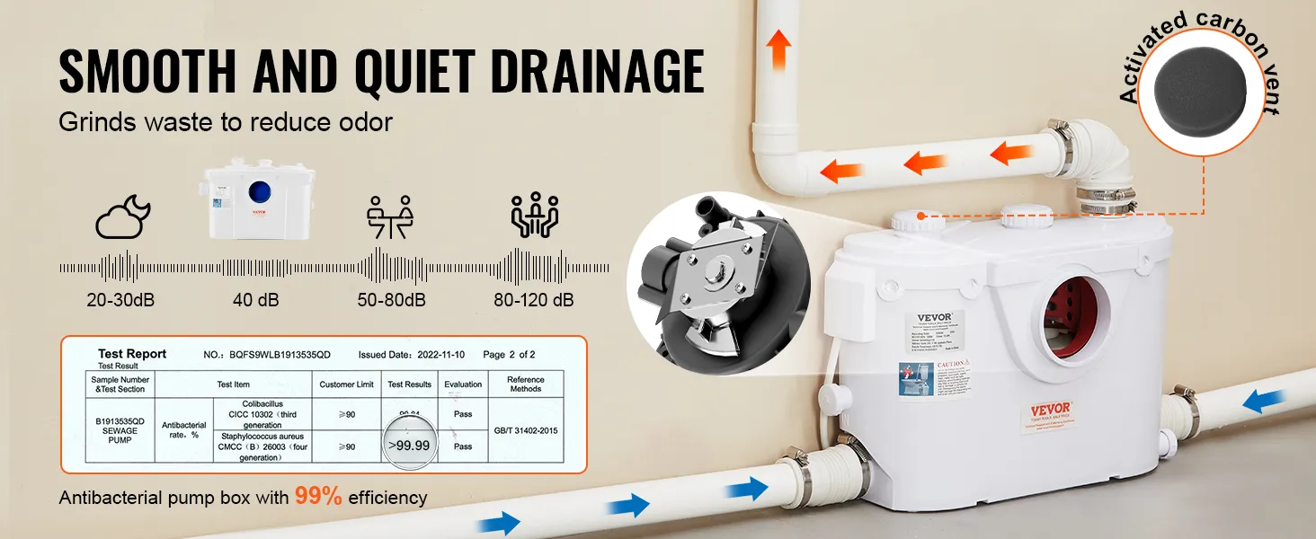De ingebouwde scherpe messen vermalen afvalwater, afval en haar tot kleine deeltjes, waardoor een gelijkmatigere waterstroom zonder verstoppingen wordt gegarandeerd. Het tijdens het proces gegenereerde geluid is stil genoeg om de normale slaap niet te verstoren.