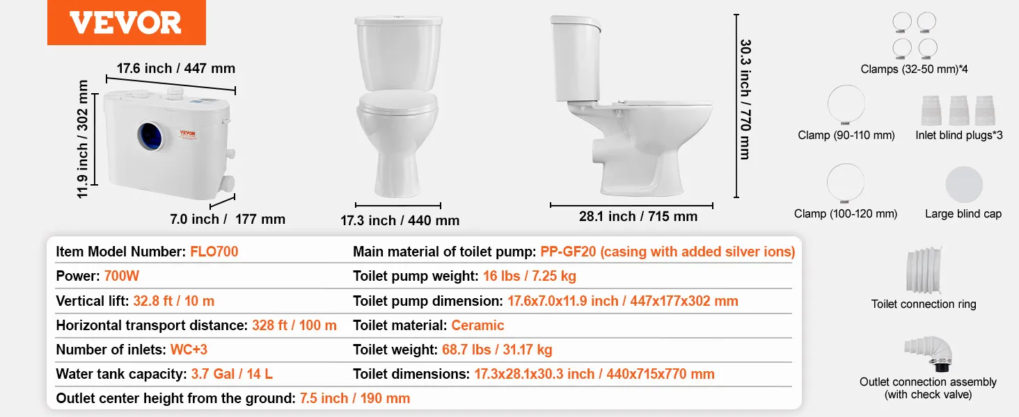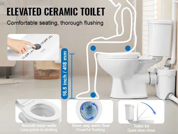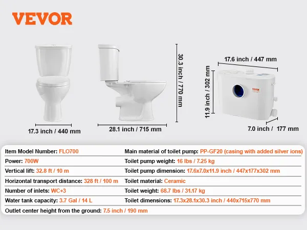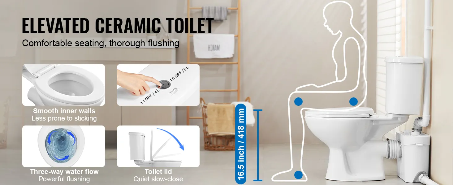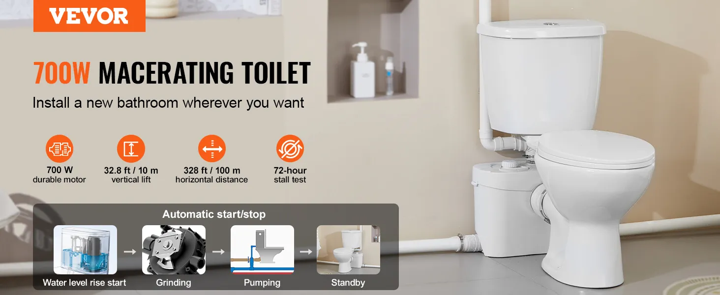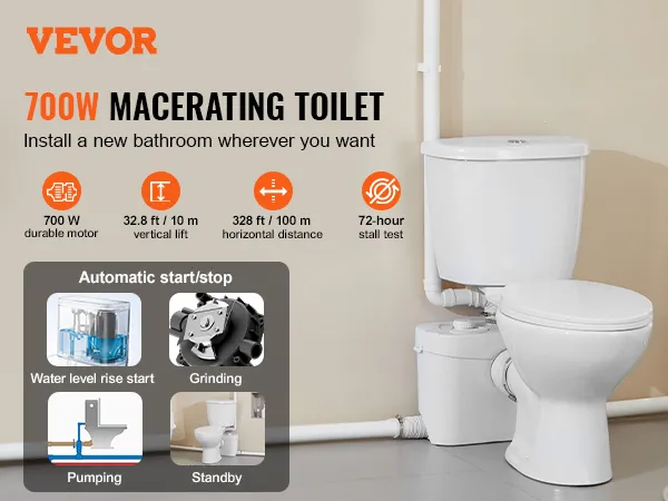 Sterke transportprestaties: Dit vermaler-toiletsysteem is speciaal ontworpen voor woningen zonder vooraf geïnstalleerde afvoerleidingen en beschikt over een duurzame motor van 700 W die uitstekende prestaties levert bij het zuigen van afvalwater en het transport van afvalwater. Dit opwaartse afvalwatersysteem bereikt een verticale hoogte van 33 voet (10 m) en een horizontale transportafstand van 328 voet (100 m).