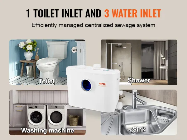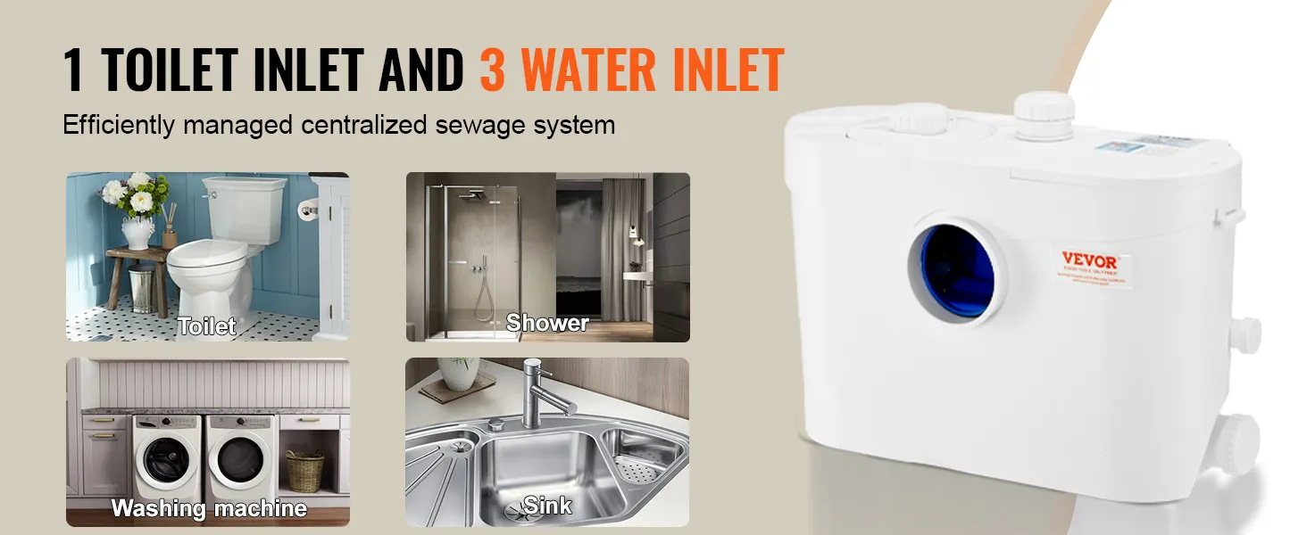 Geïntegreerde afvalwateroplossing: Naast een toiletinterface heeft dit macererende toiletsysteem met pomp 3 extra inlaten voor het aansluiten van wastafels, badkuipen, douches, wasmachines en andere afvalwaterbronnen. Het beheert effectief meerdere bronnen van afvalwater, waardoor het de perfecte oplossing is voor het creëren van een complete sanitaire ruimte waar dan ook, zoals kelders.