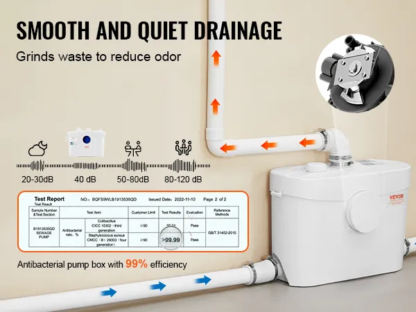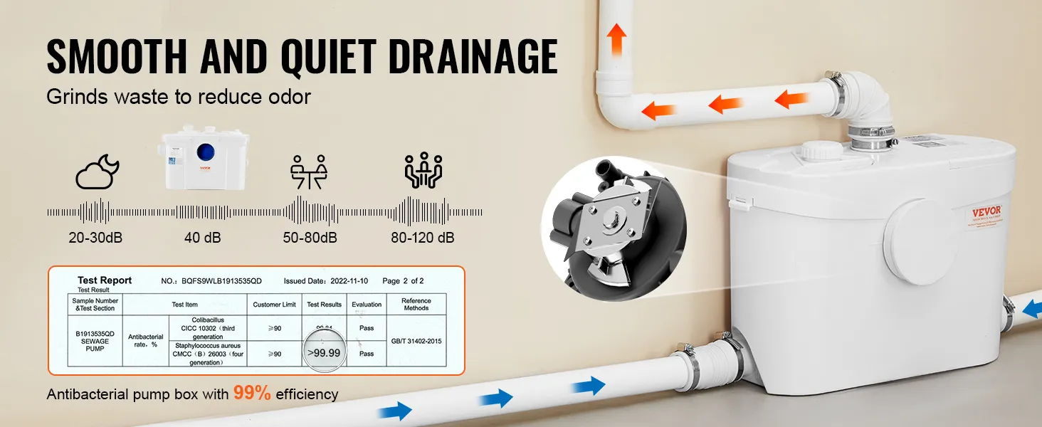 De ingebouwde scherpe messen vermalen afvalwater, afval en haar tot kleine deeltjes, waardoor een gelijkmatigere waterstroom zonder verstoppingen wordt gegarandeerd. Het tijdens het proces gegenereerde geluid is stil genoeg om de normale slaap niet te verstoren.
