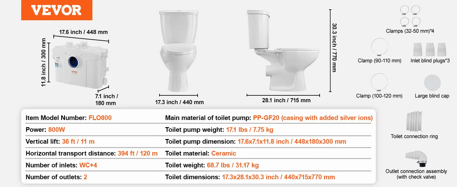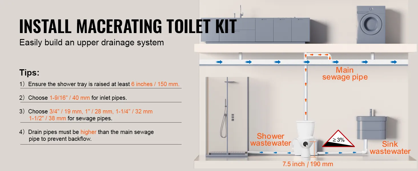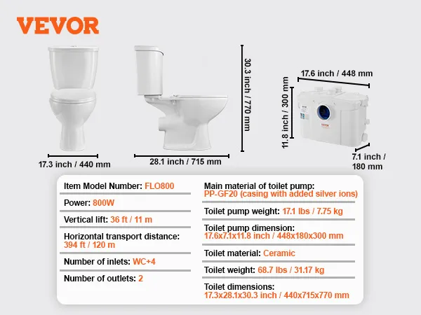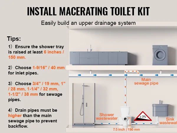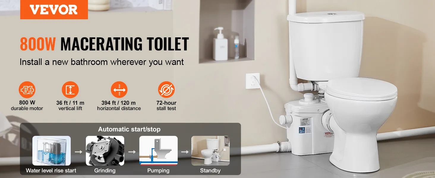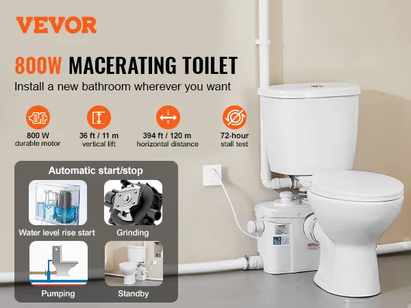 Sterke transportprestaties: Dit vermaler-toiletsysteem is speciaal ontworpen voor woningen zonder vooraf geïnstalleerde afvoerleidingen en beschikt over een duurzame motor van 800 W die uitstekende prestaties levert bij het zuigen van afvalwater en het transport van afvalwater. Dit opwaartse rioleringssysteem bereikt een verticale hoogte van 36 voet (11 m) en een horizontale transportafstand van 394 voet (120 m). Dit maakt hem ideaal voor het installeren van een toilet in kelders, garages, balkons en andere ruimtes en zorgt voor een efficiënt afvalbeheer.