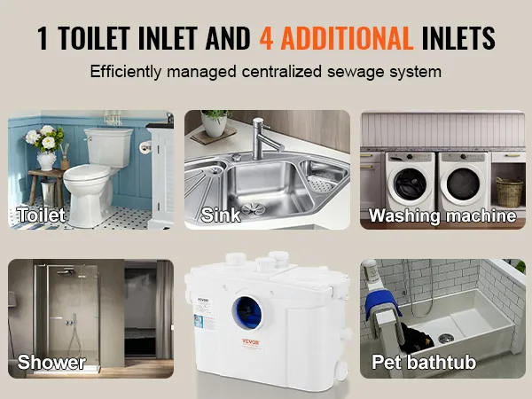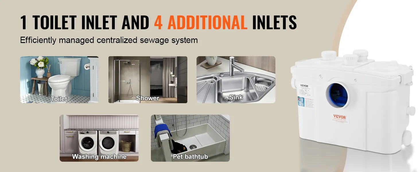 Geïntegreerde afvalwateroplossing: Naast een toiletinterface heeft dit macererende toiletsysteem met pomp 4 extra inlaten voor het aansluiten van wastafels, badkuipen, douches, wasmachines en andere afvalwaterbronnen. Het beheert effectief meerdere bronnen van afvalwater, waardoor het de perfecte oplossing is voor het creëren van een complete sanitaire ruimte waar dan ook, zoals kelders.