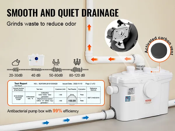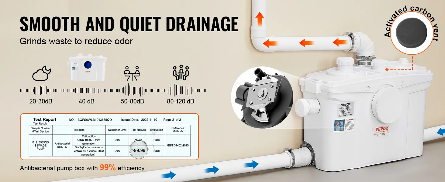De ingebouwde scherpe messen versnipperen afvalwater, afval en haar tot kleine deeltjes, waardoor een gelijkmatigere waterstroom zonder verstoppingen wordt gegarandeerd. Het geluid is zo laag dat de slaap niet wordt verstoord.