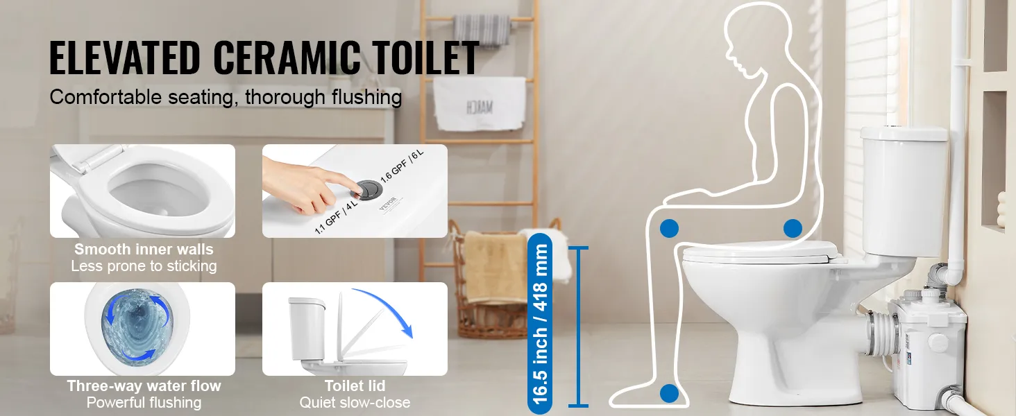 Schoon en hygiënisch: het duurzame keramische toilet met dubbele spoeling is gemakkelijk schoon te maken en heeft een verhoogd ontwerp voor gemakkelijk gebruik door mensen met beperkte mobiliteit. Het beschikt over een watertank met grote capaciteit en dubbele spoeling voor krachtige reiniging. De pomp heeft een ingebouwde ontluchting om de prestaties en ventilatie te optimaliseren, waardoor geurtjes na gebruik worden verminderd.