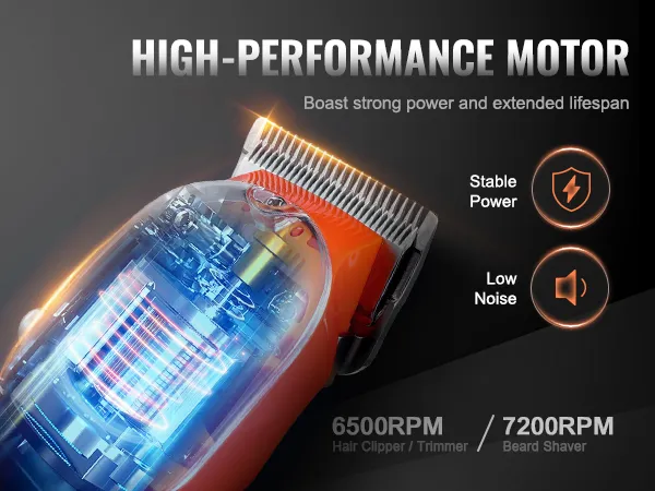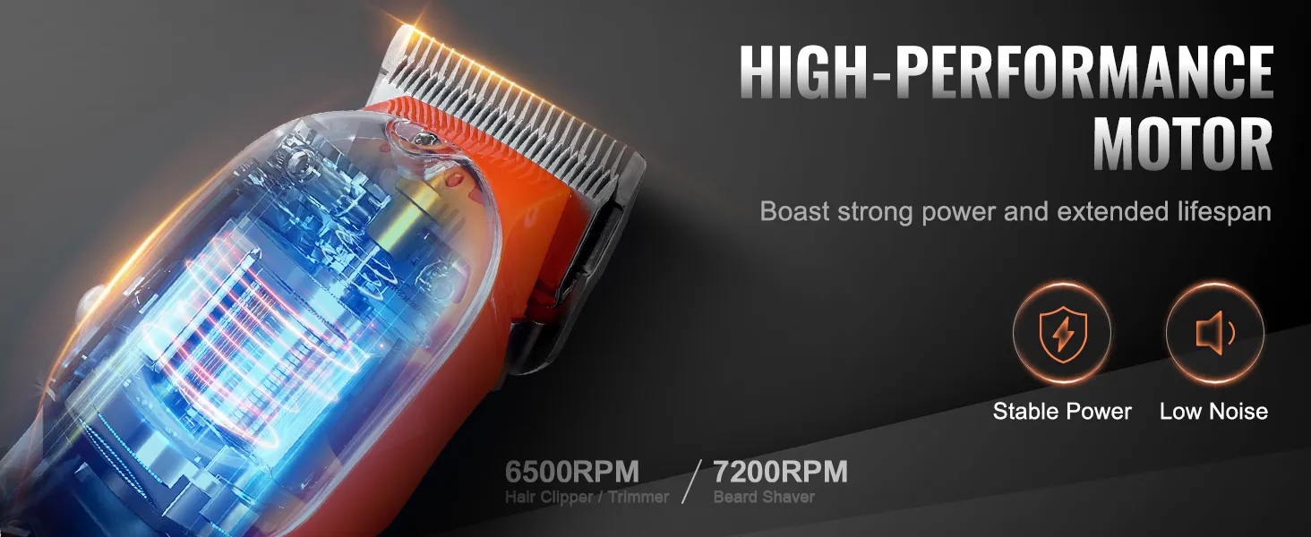 Enjoy seamless haircuts with our high-speed hair clipper and trimmer, operating at 6500 rpm, paired with a robust 7200 rpm beard shaver. The strong motor, combined with precision-engineered blades, ensure smooth cuts without the hassle of stucking hair.