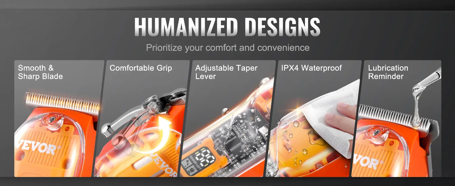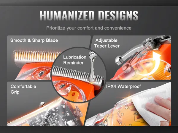 Comfort and convenience at its core: The smooth and sharp blade, ergonomic grip, adjustable taper lever, and helpful oil reminder are all meticulously designed to bring you an effortless and comfortable grooming experience, make hair trimming much easier.