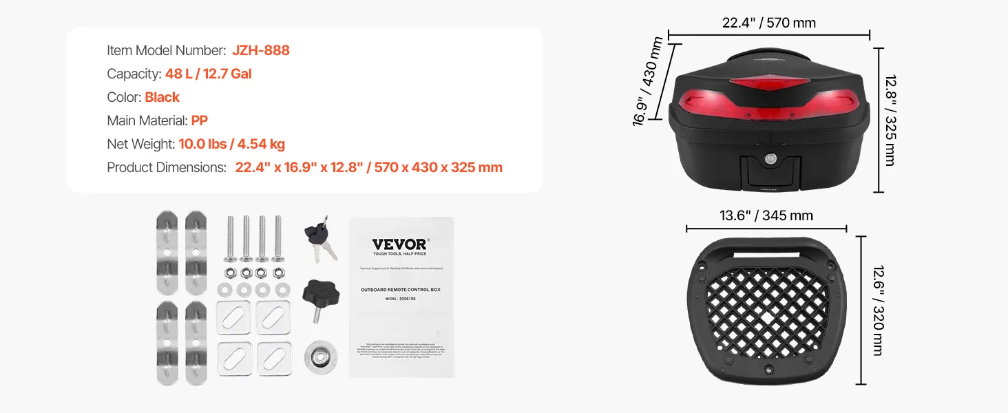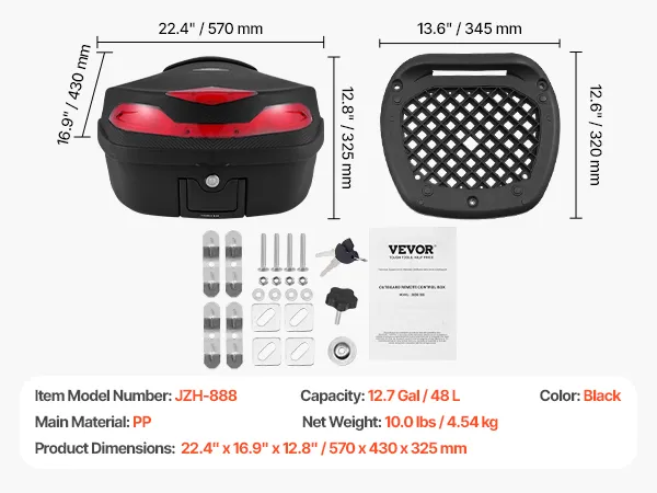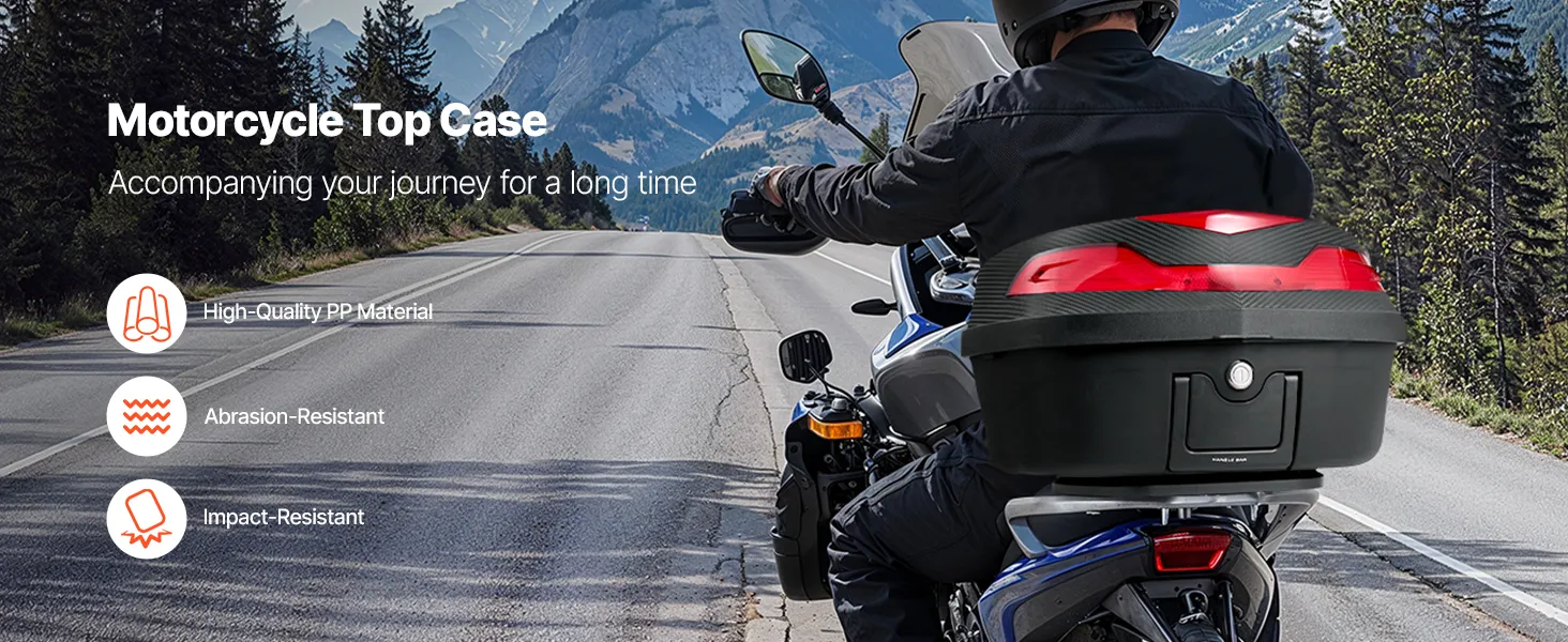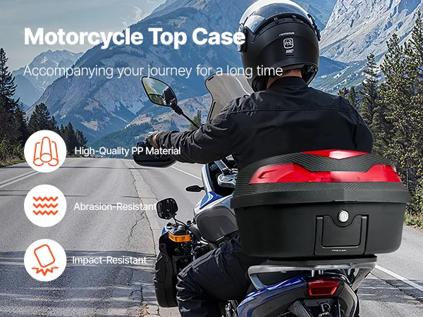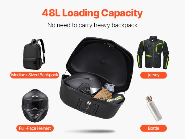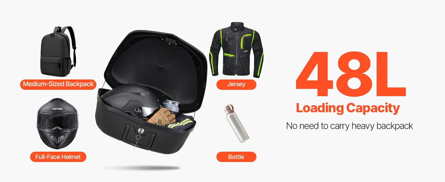 48L Large Capacity: Offering 48L of space, this tailbox can store a full helmet, daily essentials (such as shoes, large motorcycle jacket), medium-sized backpack, gloves, umbrella, and rain gear, making it ideal for short trips. Equipped with a secure zinc alloy lock to guard your belongings from theft.
