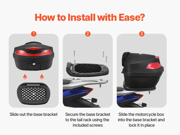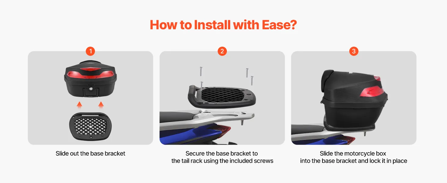 Versatile & Compatible: The trunk features a multi-hole mounting base, making it compatible with a variety of motorcycle tail racks. Whether you have a Harley, Yamaha, scooter, or standard motorcycle, you can easily install the trunk without drilling holes.