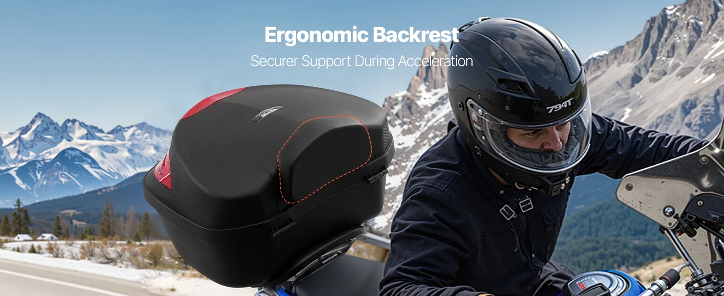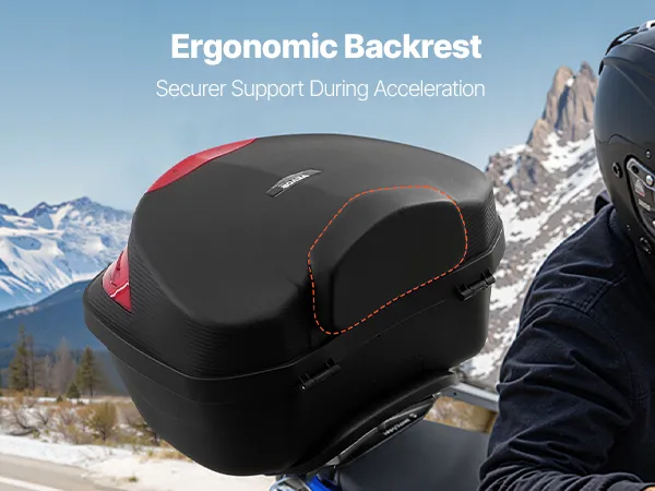 The motorcycle top case’s built-in back cushion offers comfort and lumbar support during acceleration, ensuring a smooth ride for you or your passenger.