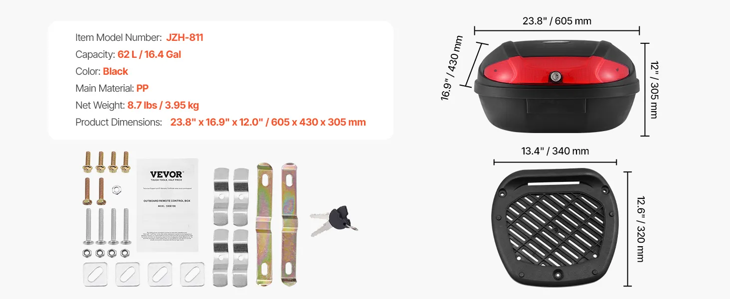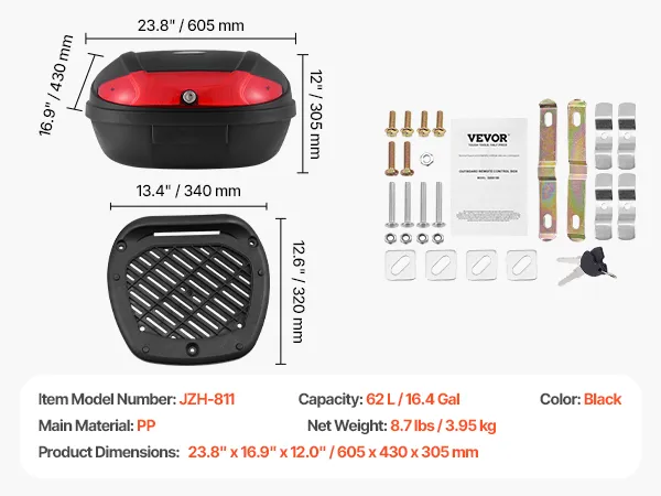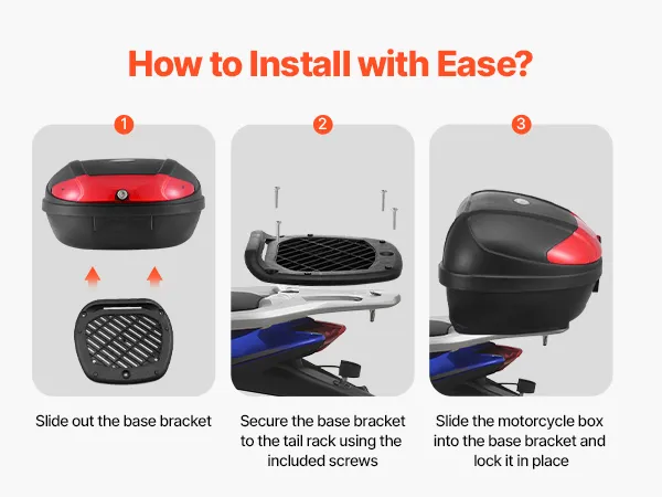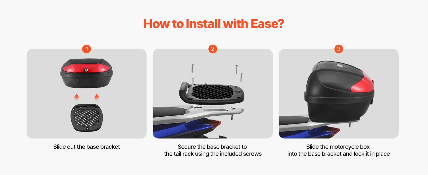 Veelzijdig en compatibel: de kofferbak is voorzien van een montagebasis met meerdere gaten, waardoor hij compatibel is met een groot aantal achterdragers voor motorfietsen. Of je nu een Harley, een Yamaha, een scooter of een gewone motor hebt, je installeert de kofferbak eenvoudig zonder gaten te boren.