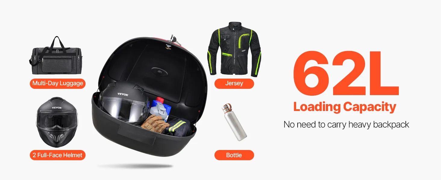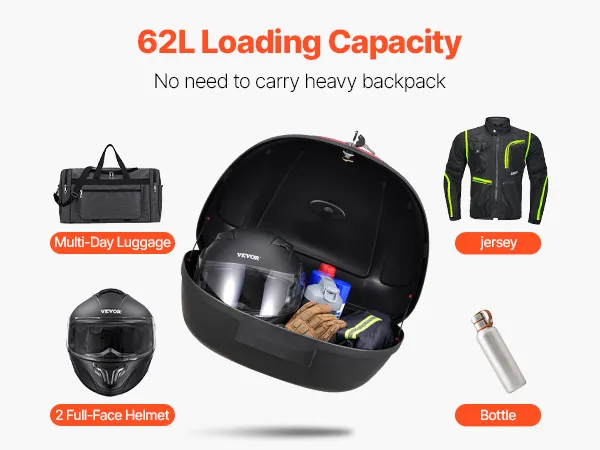 Extra grote capaciteit van 62 liter: met een royale capaciteit van 62 liter biedt deze achterbak plaats aan twee integraalhelmen, een grote motorjas, bagage voor meerdaagse tochten (inclusief schoenen en kleding), handschoenen, paraplu en regenkleding. Ideaal voor langere reizen en voorzien van een robuust veiligheidsslot van zinklegering om ervoor te zorgen dat uw bezittingen veilig blijven.