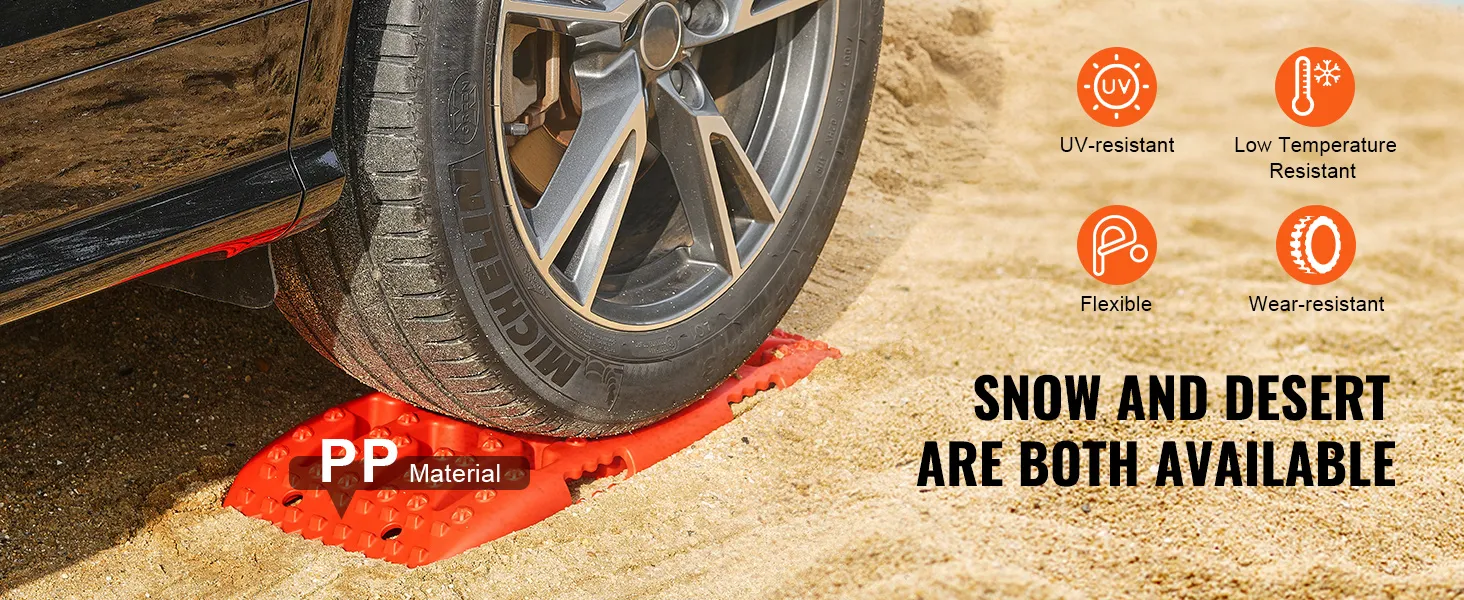 De trekplaten zijn gemaakt van hoogwaardig PP-materiaal en zijn geschikt voor zowel hoge als lage temperaturen. Ze zijn duurzaam, flexibel en kunnen het gewicht van het voertuig en de wrijving van de banden dragen.