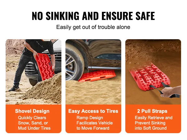 De schuine uiteinden dienen ook als scheppen, zodat u gemakkelijk zand of sneeuw van uw banden kunt verwijderen. Het skid-ontwerp vergemakkelijkt de bandenaangrijping en tractie, wat een soepel herstelproces garandeert. Met twee meegeleverde trekriemen is de inzet eenvoudig en efficiënt.