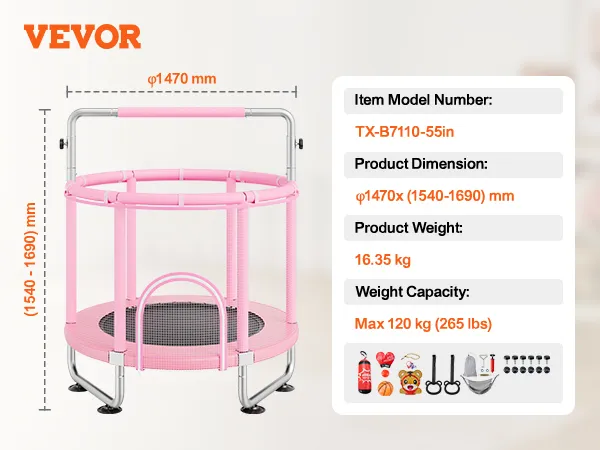 Er zijn drie verschillende hoogtes: 59 inch, 60 inch en 62 inch. Onze minitrampoline voor baby's en peuters is geschikt voor alle leeftijden en maakt de natuurlijke energie van kinderen effectief vrij voor de beste gezinsactiviteit.