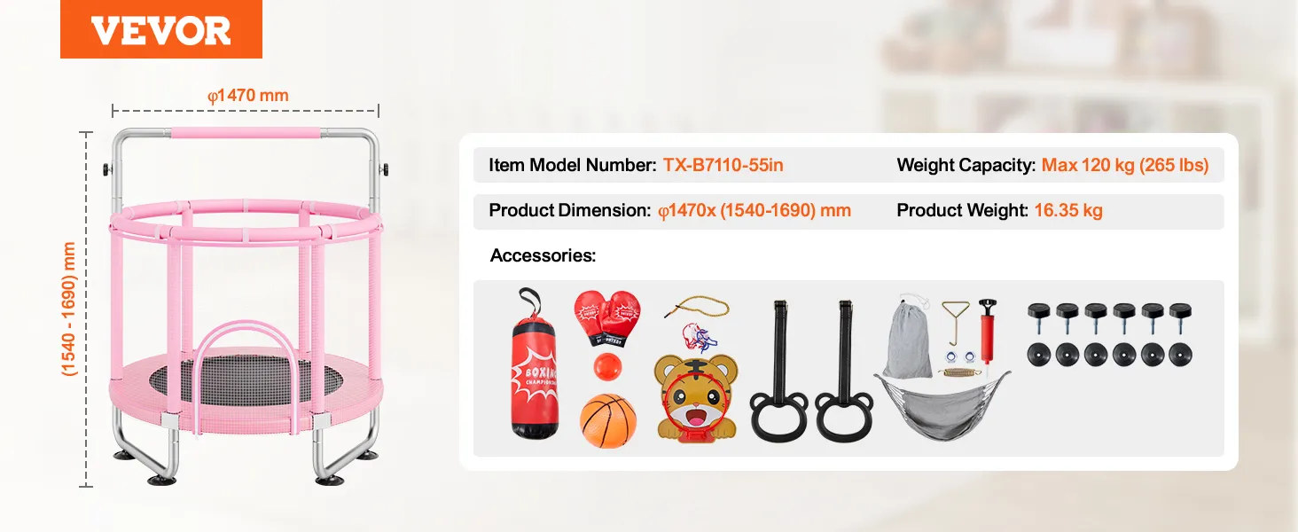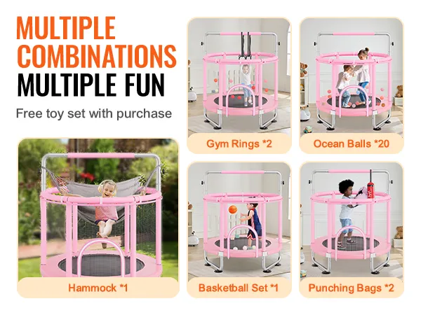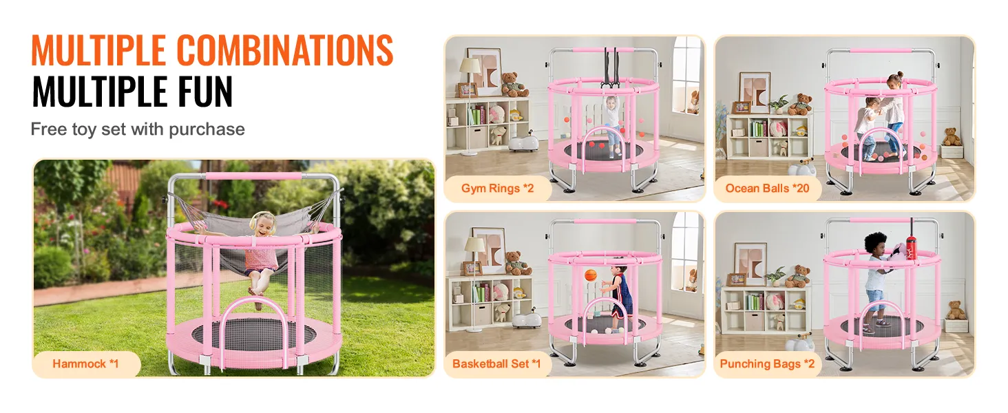 De peutertrampoline wordt geleverd inclusief accessoires zoals ringen, schommels, zandzakken, strandballen en een basketbalset. Het kan binnen, buiten, in de tuin of achtertuin worden geplaatst, houdt peuters uit de buurt van elektronica en bevordert de fysieke groei.