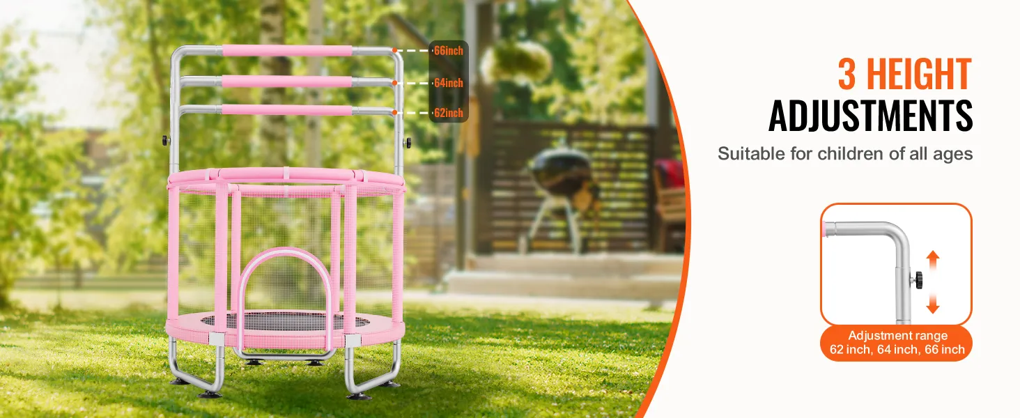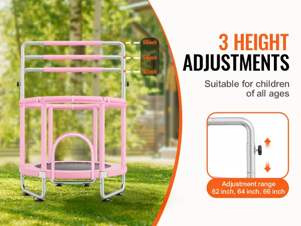 3 verstelbare hoogtes: het verstelbare handvatontwerp maakt hoogteaanpassingen mogelijk van 59 inch (149,86 cm), 60 inch (152,4 cm) of 62 inch (157,48 cm), geschikt voor kinderen van 3 tot 12 jaar. Deze peutertrampoline voor binnen en buiten kan de natuurlijke energie van kinderen effectief vrijgeven, waardoor het het beste gezinsactiviteitsspel is. Het kan binnen, buiten, in de tuin of achtertuin worden geïnstalleerd.