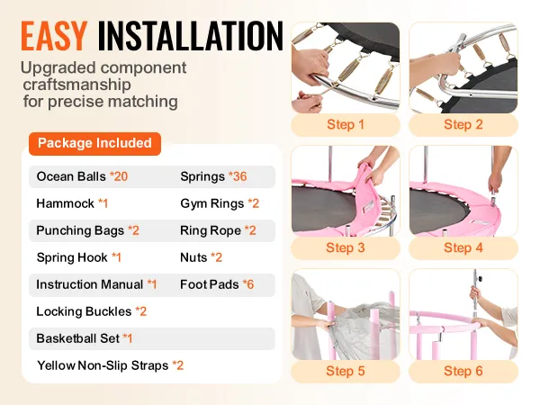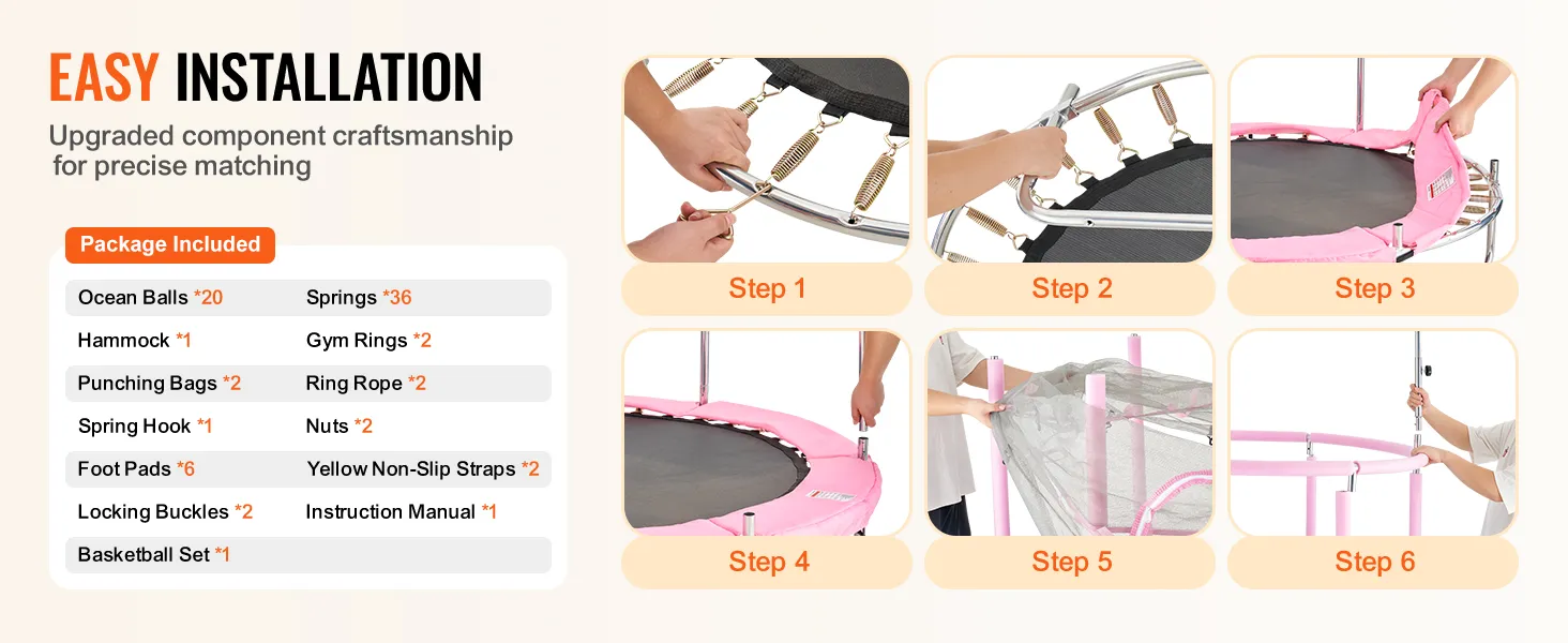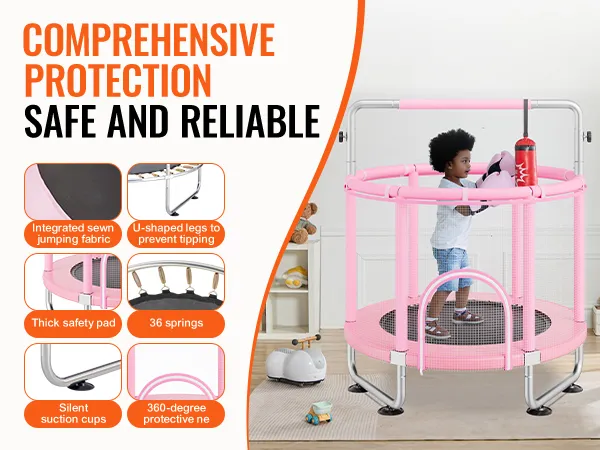 Robuuste en stabiele materialen: de nieuw verbeterde verdikte metalen beenstangen zijn bestand tegen buigen en vervorming en zijn gemaakt van een massieve stalen constructie voor sterkte en stabiliteit. De U-vormige poten zijn voorzien van zes zuignappen die antislip en stil zijn, waardoor kinderen naar hartelust kunnen springen zonder anderen te storen. De PP-springmat is slijtvast, duurzaam, waterdicht en gemakkelijk schoon te maken.