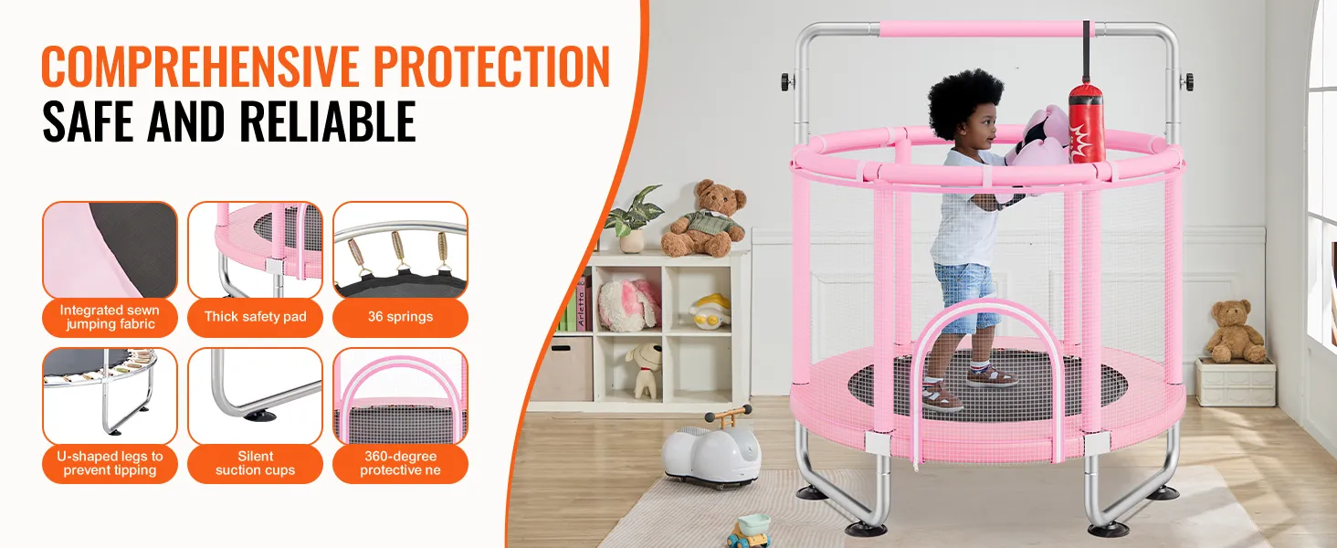 Deze thuistrampoline voor peuters kan zowel binnen als buiten gebruikt worden. Het biedt kinderen meer beweging om kracht en uithoudingsvermogen te ontwikkelen, terwijl speelse activiteiten worden aangemoedigd die de flexibiliteit en coördinatie verbeteren.