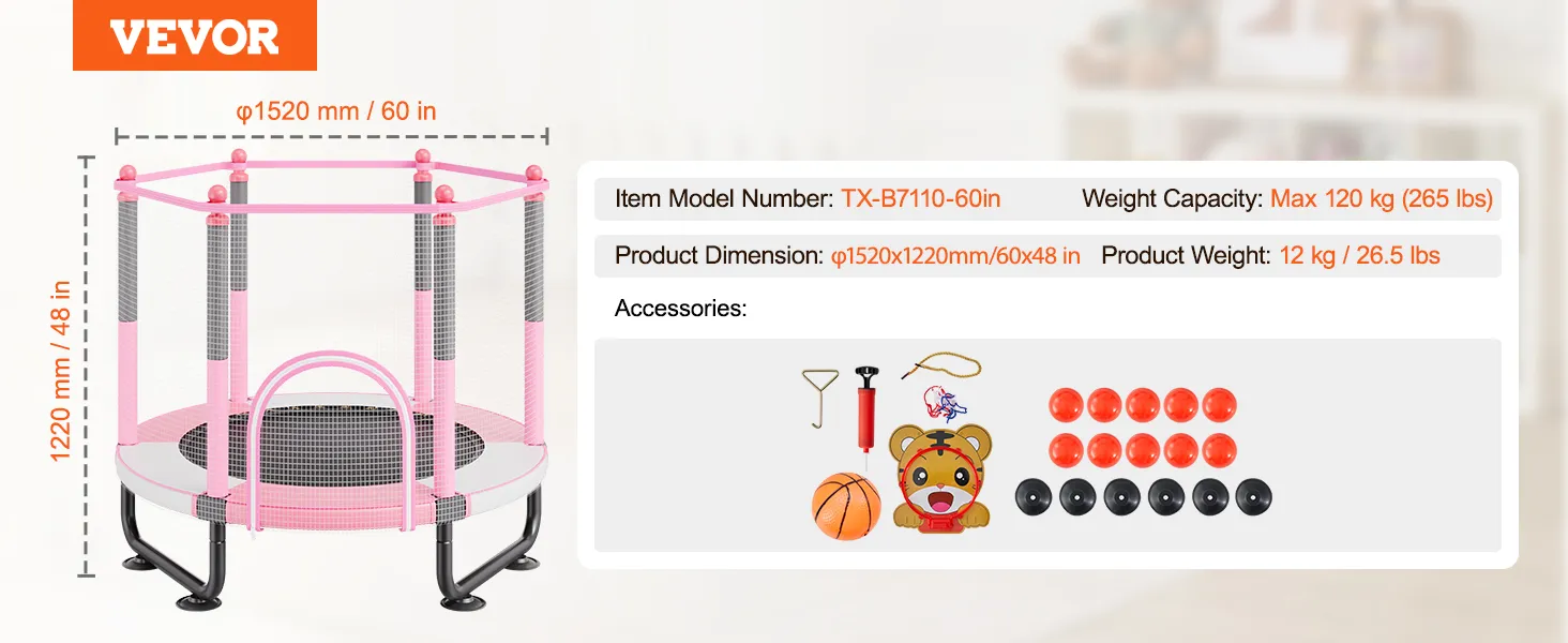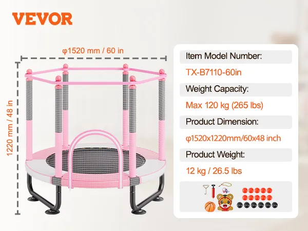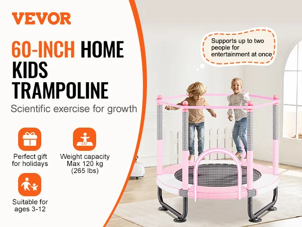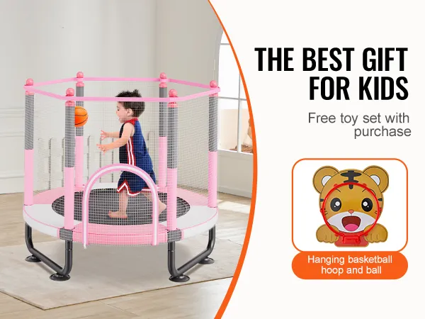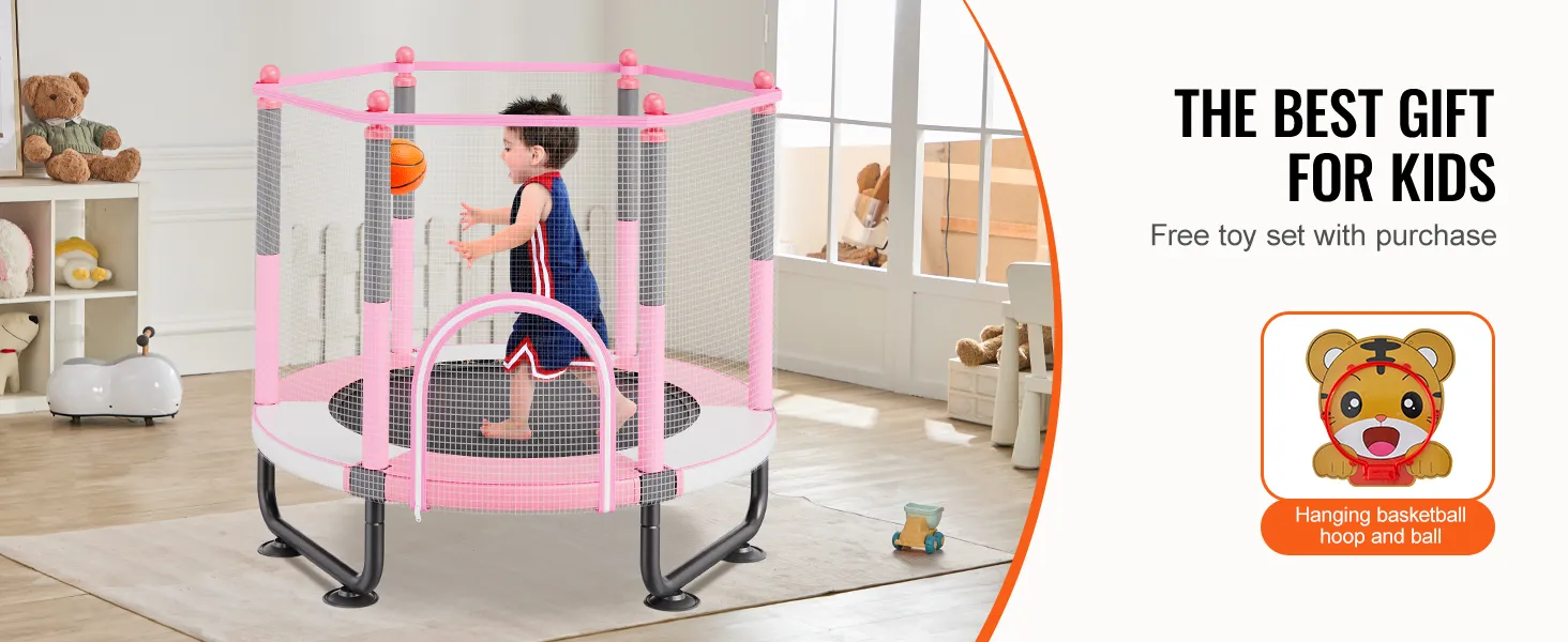VEVOR Kindertrampoline Buitentrampoline Mini Leisure Trampoline 1545 mm voor peuters met veiligheidsnet en basketbalring, verjaardagscadeau Kerstspeelgoed voor kinderen vanaf 3 jaar Roze