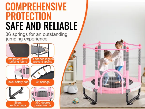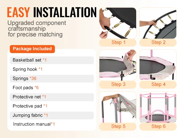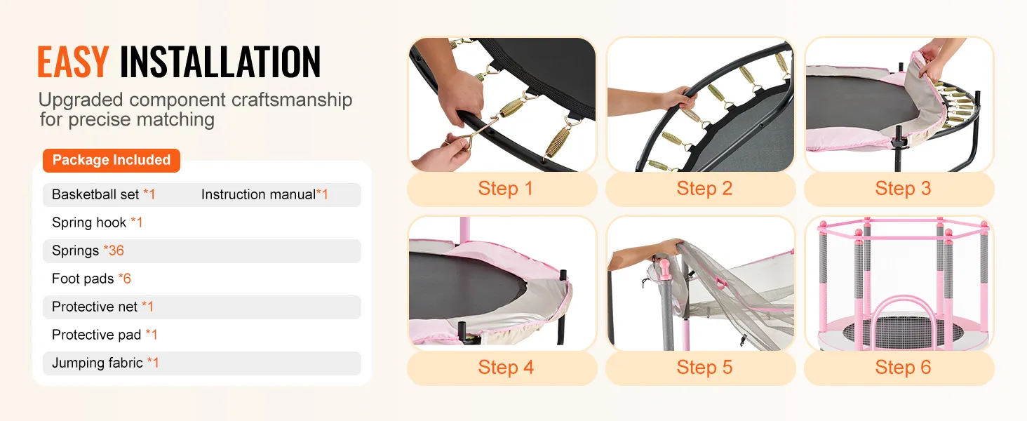 Robuuste en stabiele materialen: de nieuw verbeterde verdikte metalen beenstangen zijn bestand tegen buigen en vervorming en zijn gemaakt van een massieve stalen constructie voor sterkte en stabiliteit. De U-vormige poten zijn voorzien van zes zuignappen die antislip en stil zijn, waardoor kinderen naar hartelust kunnen springen zonder anderen te storen. De PP-springmat is slijtvast, duurzaam, waterdicht en gemakkelijk schoon te maken.