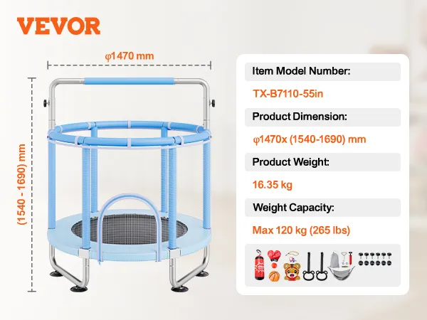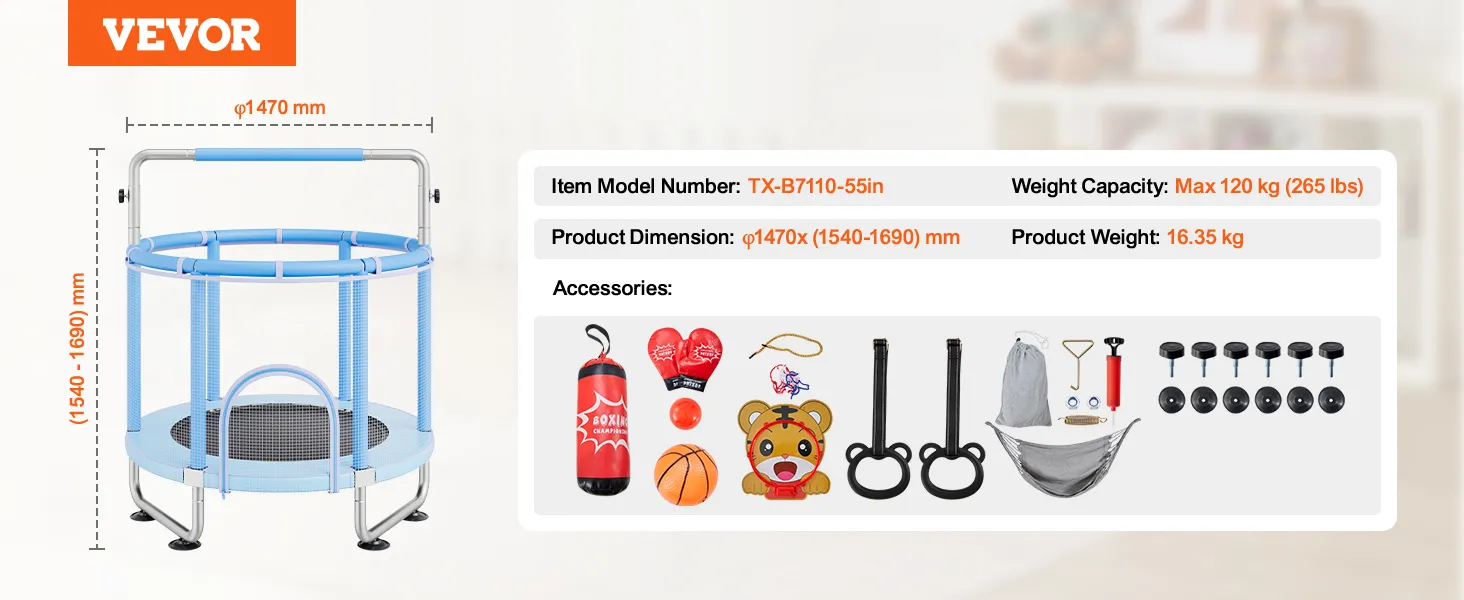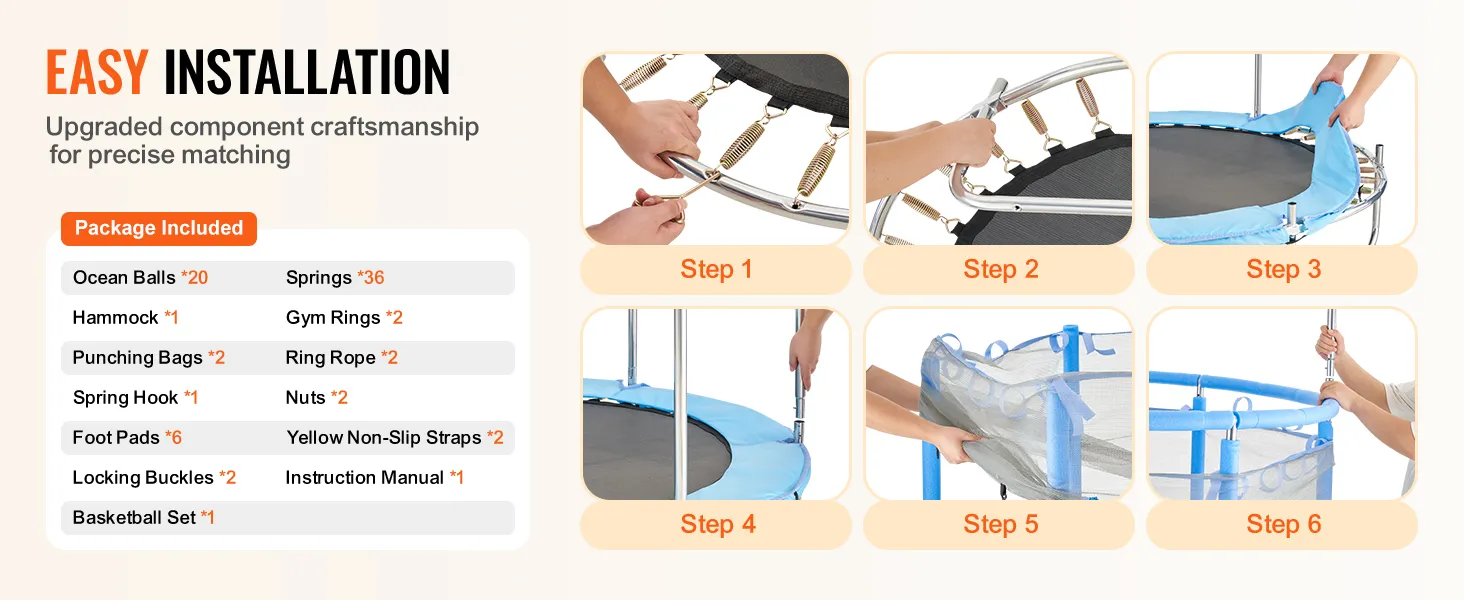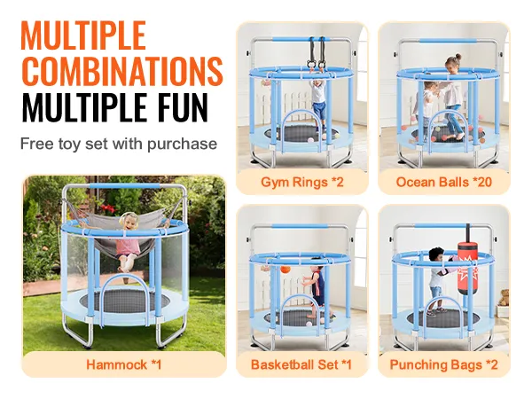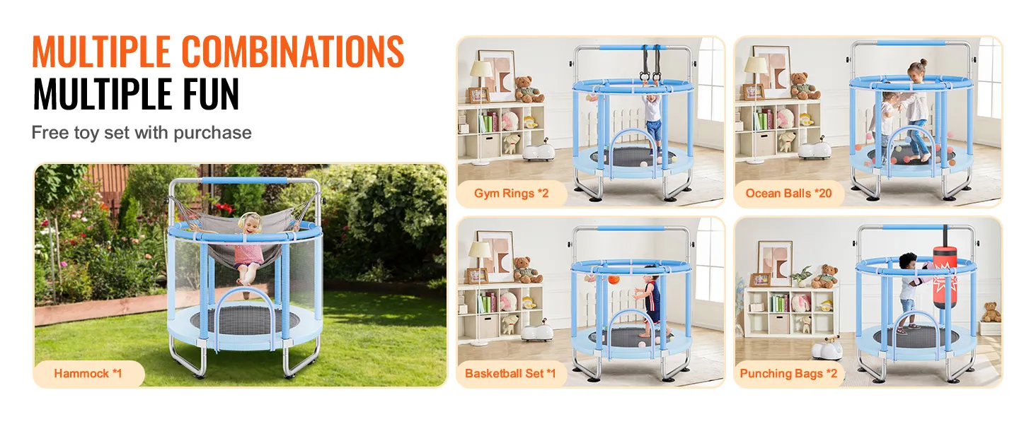 De peutertrampoline wordt geleverd inclusief accessoires zoals ringen, schommels, zandzakken, strandballen en een basketbalset. Het kan binnen, buiten, in de tuin of achtertuin worden geplaatst, waardoor peuters uit de buurt van elektronica worden gehouden en aangemoedigd worden