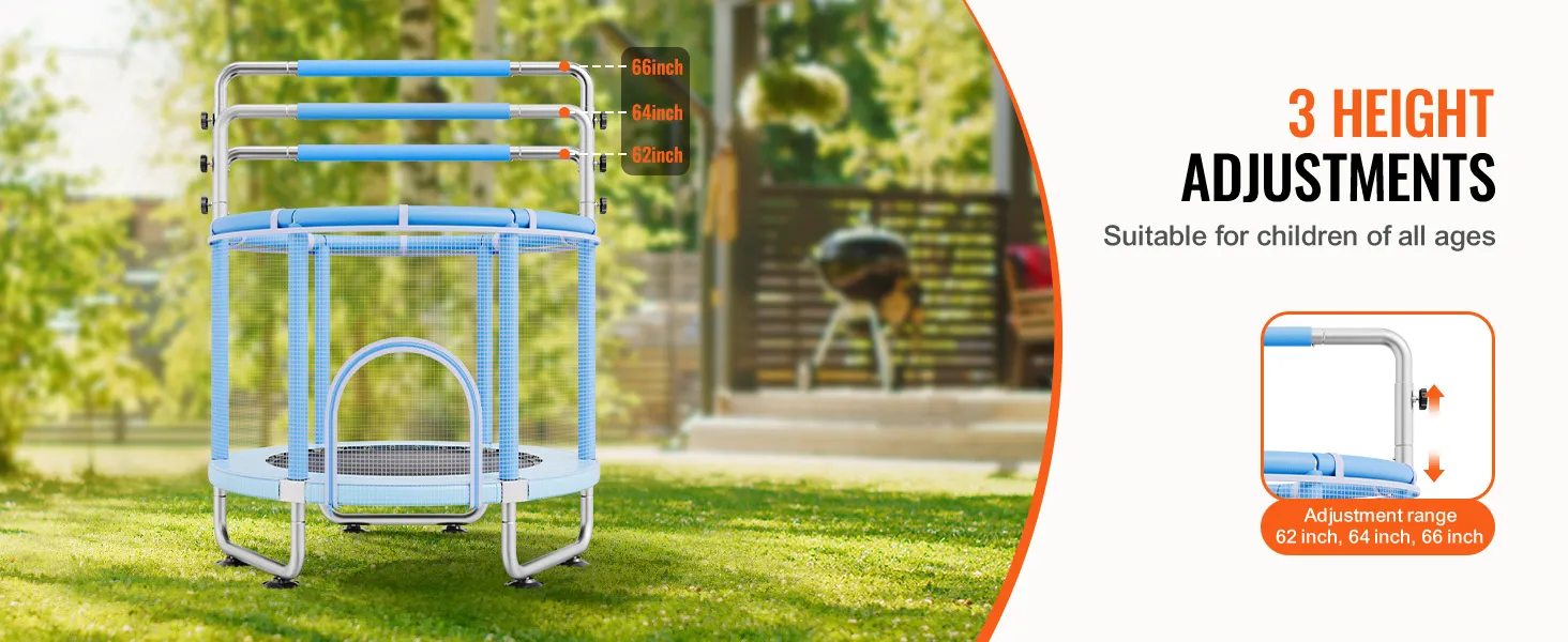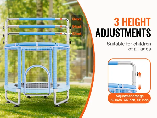 Er zijn drie hoogteopties beschikbaar, verstelbaar van 59 inch, 60 inch of 62 inch. Onze minitrampoline voor baby's en peuters is geschikt voor alle leeftijden en maakt de natuurlijke energie van kinderen effectief vrij voor de beste gezinsactiviteit.