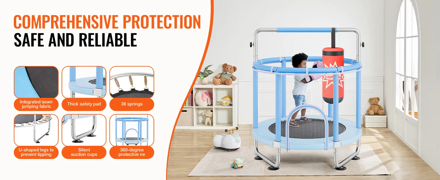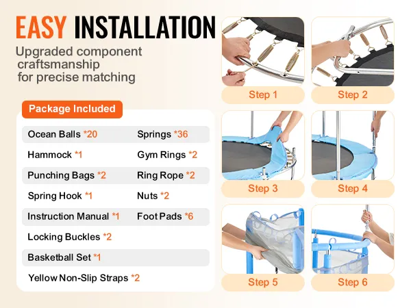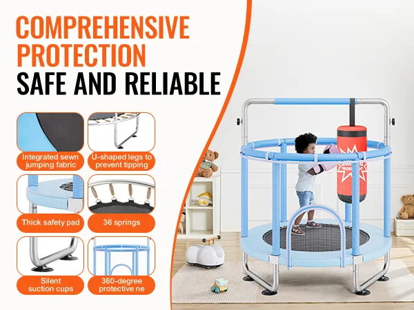 Robuuste en stabiele materialen: de nieuw verbeterde verdikte metalen beenstangen zijn bestand tegen buigen en vervorming en zijn gemaakt van een massieve stalen constructie voor sterkte en stabiliteit. De U-vormige poten zijn voorzien van zes zuignappen die antislip en stil zijn, waardoor kinderen naar hartelust kunnen springen zonder anderen te storen. De PP-springmat is slijtvast, duurzaam, waterdicht en gemakkelijk schoon te maken.