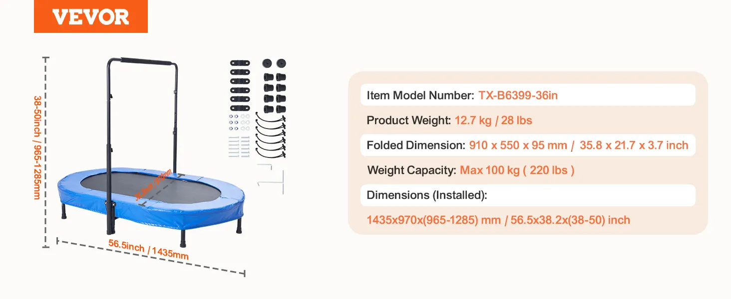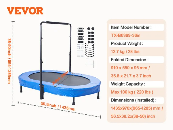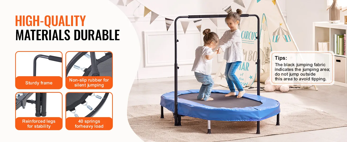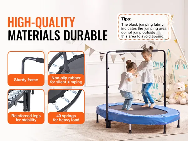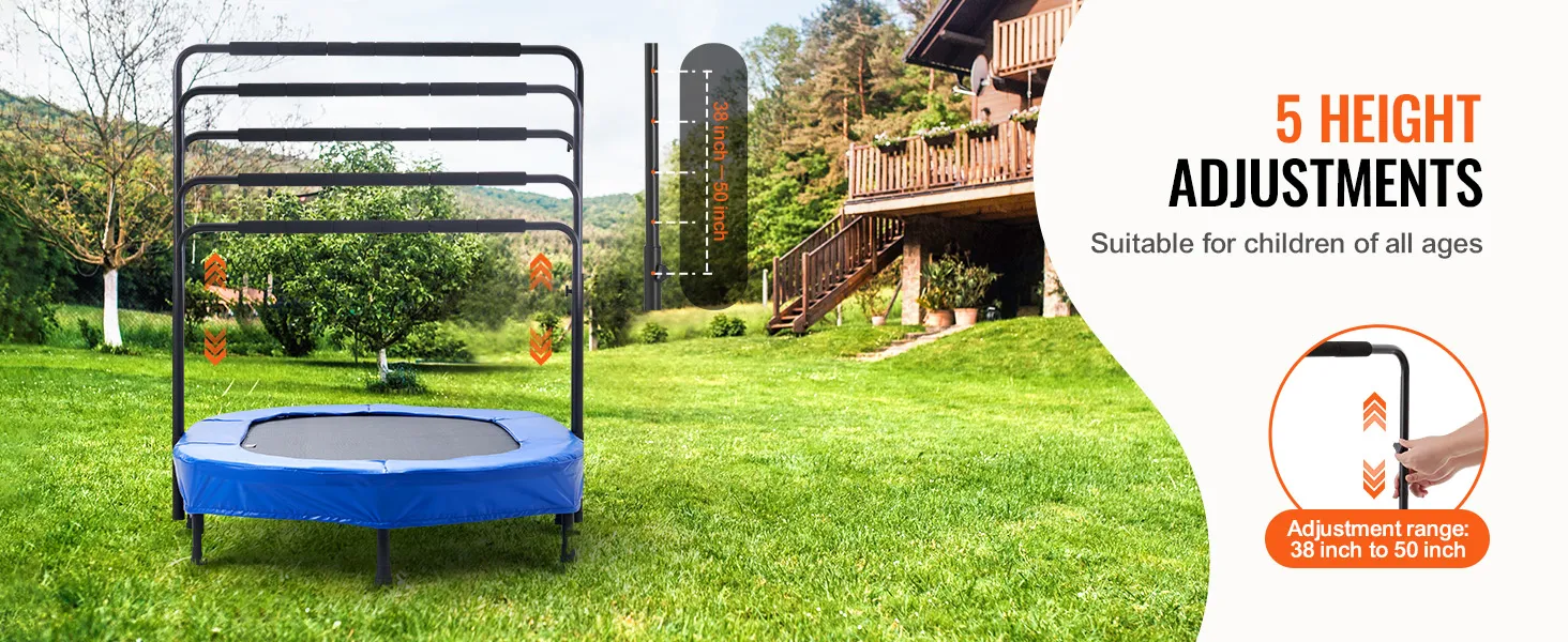 5 verstelbare hoogtes: het verstelbare handvatontwerp maakt hoogteaanpassingen mogelijk van 38 tot 45 inch (965 tot 1285 mm), geschikt voor kinderen van 3 tot 12 jaar. Deze peutertrampoline voor binnen en buiten kan de natuurlijke energie van kinderen effectief vrijgeven, waardoor het het beste gezinsactiviteitsspel is. Het kan binnen, buiten, in de tuin of in de achtertuin worden geïnstalleerd.