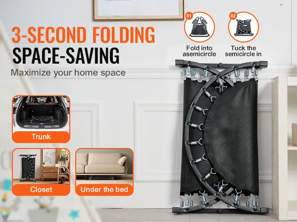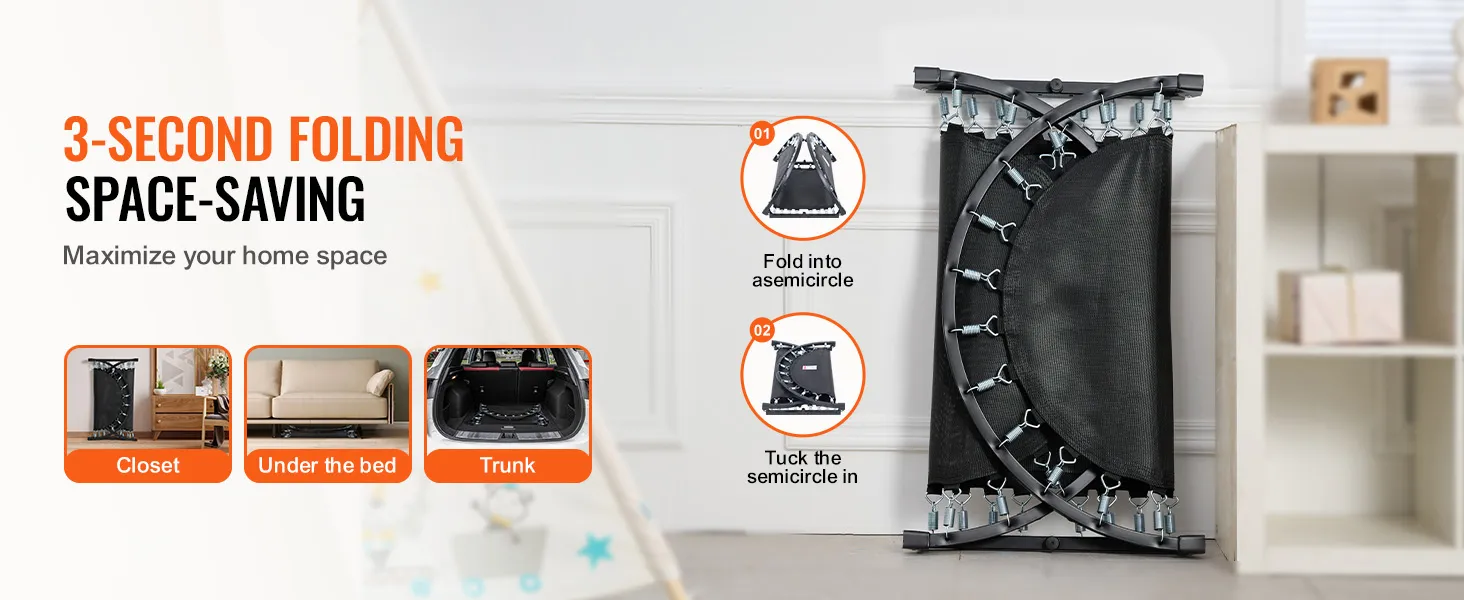 Snel opbergen dankzij opvouwbaar ontwerp: Dankzij het opvouwbare frameontwerp neemt onze minitrampoline voor baby's en peuters in opgevouwen toestand slechts een derde van het oorspronkelijke volume in beslag, waardoor opbergen eenvoudig en ruimtebesparend is. Hij kan onder een bank of in de kofferbak van een auto worden opgeborgen. Het opvouwbare ontwerp maakt hem ook gemakkelijk te vervoeren, zodat kinderen kunnen springen waar ze maar willen.