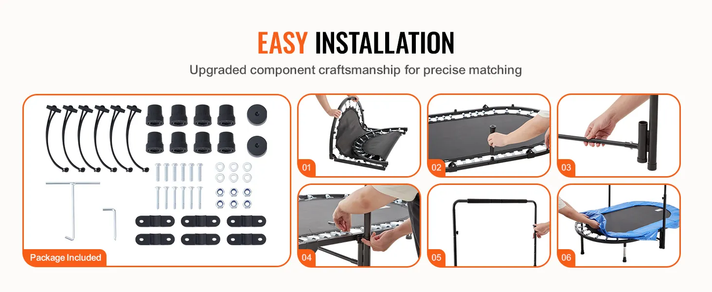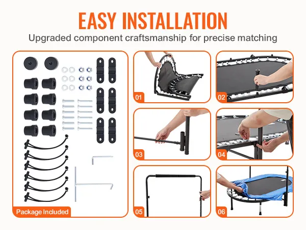 Robuuste en stabiele materialen: de nieuw verbeterde verdikte metalen pootstangen zijn bestand tegen buigen en vervorming en zorgen voor een solide stabiliteit. De PP-springmat is slijtvast, duurzaam, waterdicht en gemakkelijk schoon te maken. Met 40 veren die een maximaal gewicht van 100 kg kunnen dragen, zorgt de sporttrampoline voor veiligheid bij elke sprong.