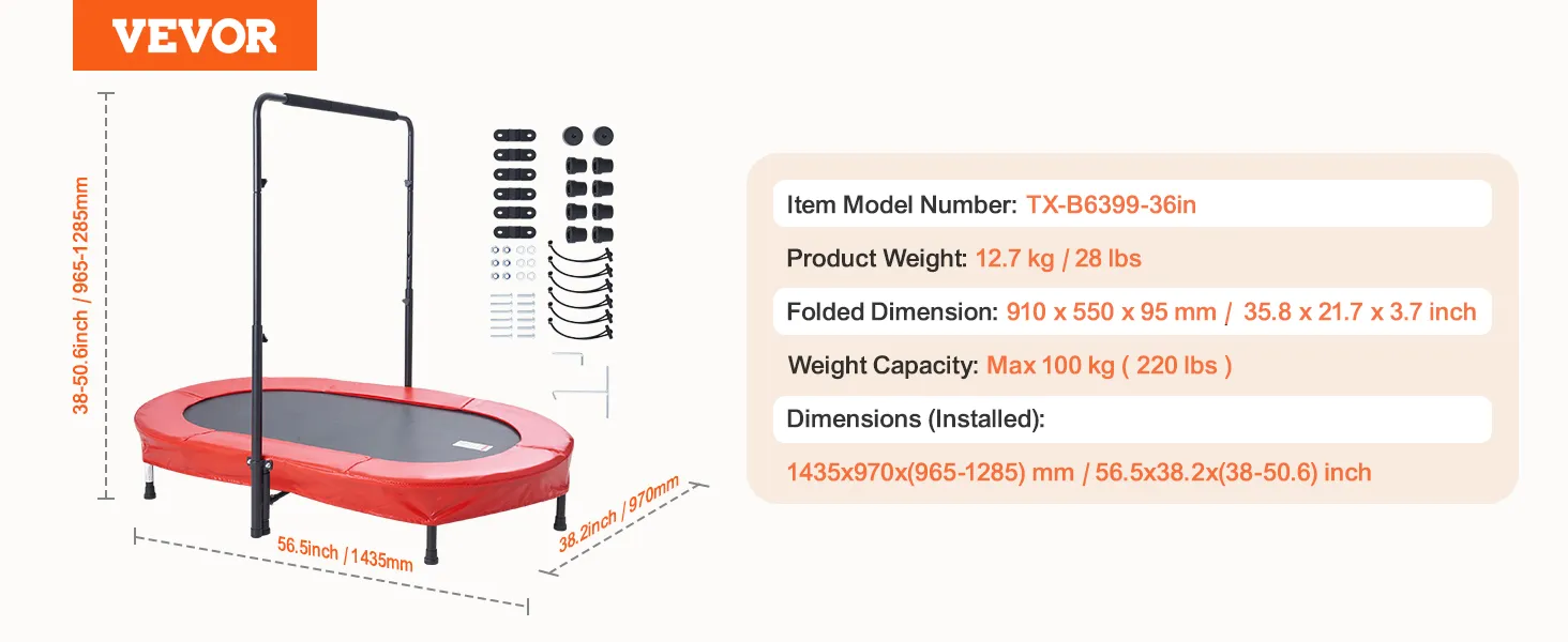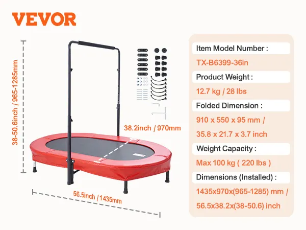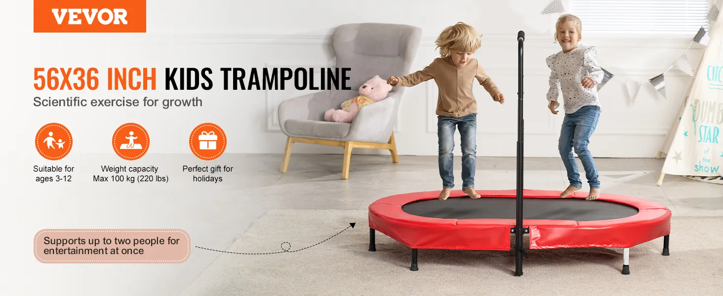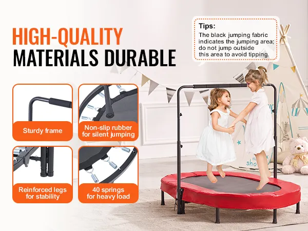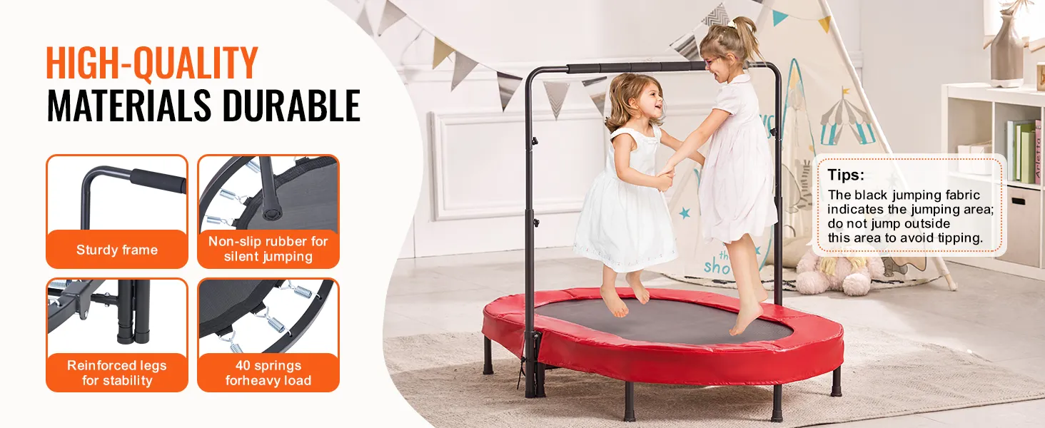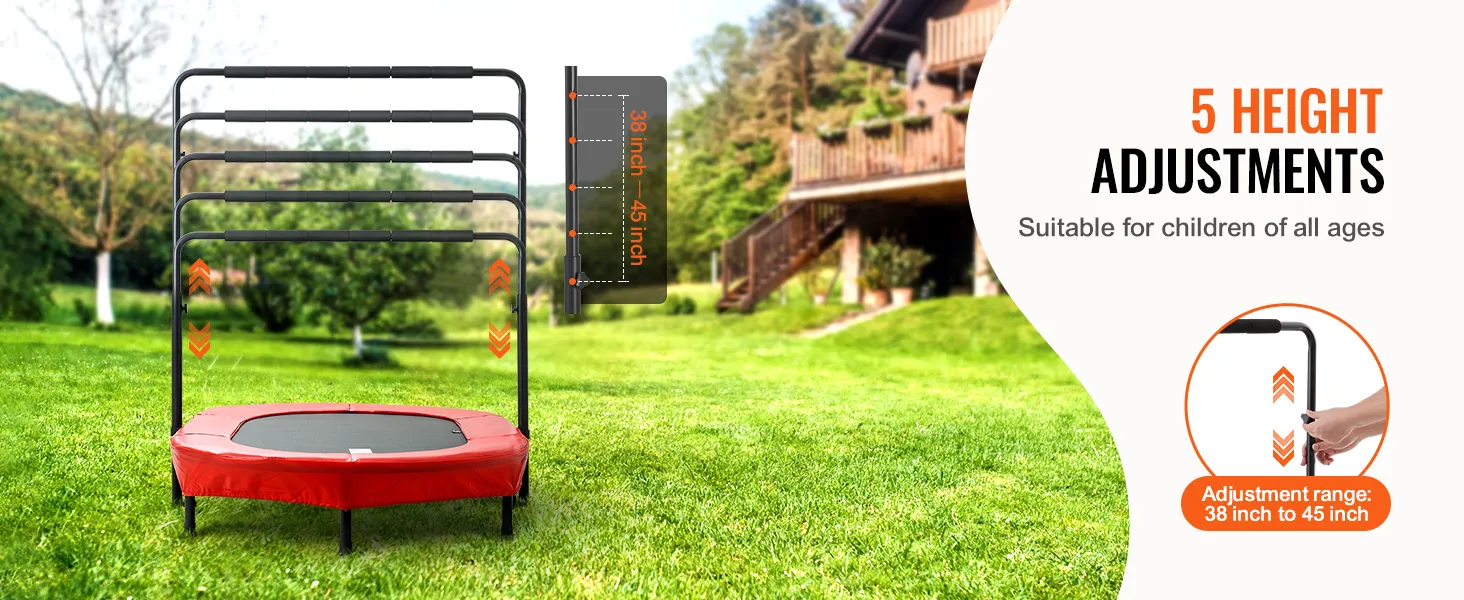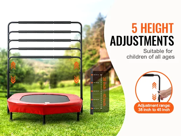 5 verstelbare hoogtes: het verstelbare handvatontwerp maakt hoogte-instellingen mogelijk van 38 tot 45 inch (96,52 tot 114,3 cm), geschikt voor kinderen van 3 tot 12 jaar. Deze peutertrampoline voor binnen en buiten kan de natuurlijke energie van kinderen effectief vrijgeven, waardoor het het beste gezinsactiviteitsspel is. Het kan binnen, buiten, in de tuin of in de achtertuin worden geïnstalleerd.
