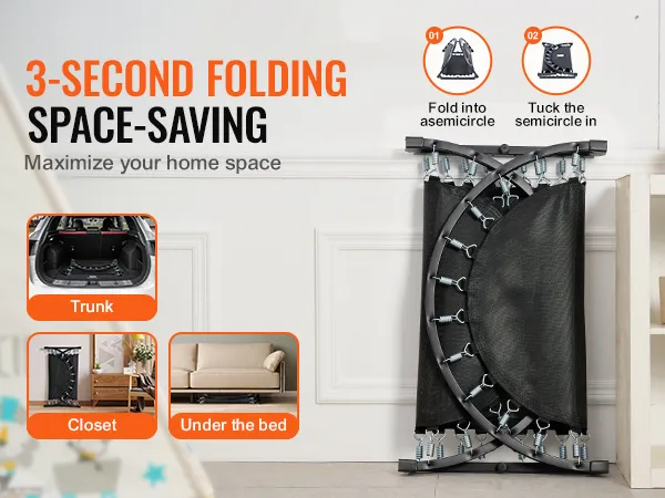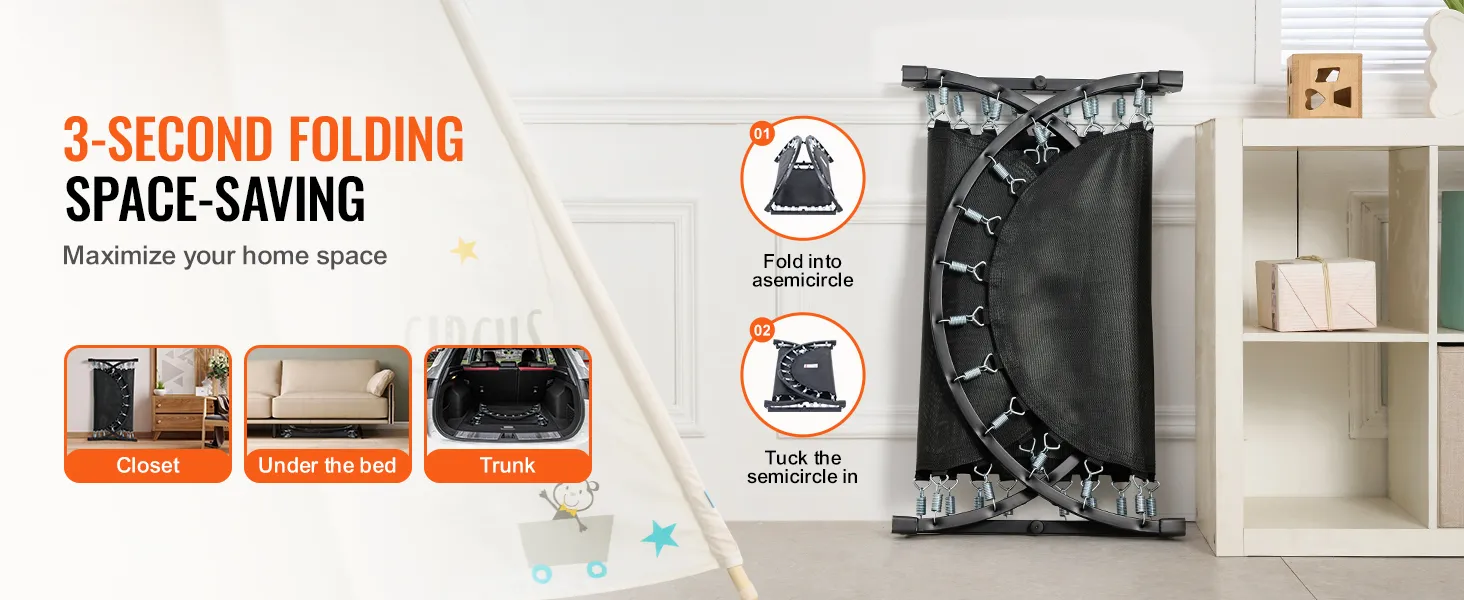 Snel opbergen dankzij opvouwbaar ontwerp: Dankzij het opvouwbare frameontwerp neemt onze minitrampoline voor baby's en peuters in opgevouwen toestand slechts een derde van het oorspronkelijke volume in beslag, waardoor opbergen eenvoudig en ruimtebesparend is. Hij kan onder een bank of in de kofferbak van een auto worden opgeborgen. Het opvouwbare ontwerp maakt hem ook gemakkelijk te vervoeren, zodat kinderen kunnen springen waar ze maar willen.