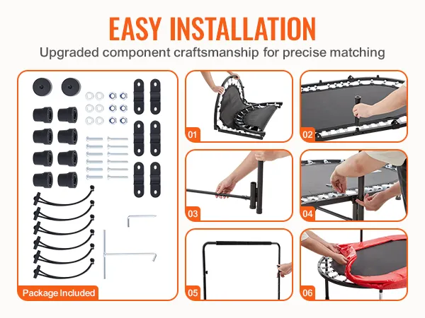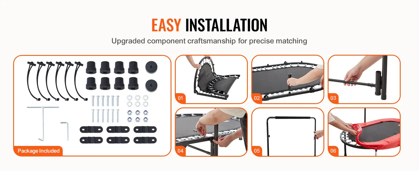 Robuuste en stabiele materialen: de nieuw verbeterde verdikte metalen pootstangen zijn bestand tegen buigen en vervorming en zorgen voor een solide stabiliteit. De PP-springmat is slijtvast, duurzaam, waterdicht en gemakkelijk schoon te maken. Met 40 veren die een maximaal gewicht van 100 kg (220 lbs) kunnen dragen, zorgt de sporttrampoline voor veiligheid bij elke sprong.